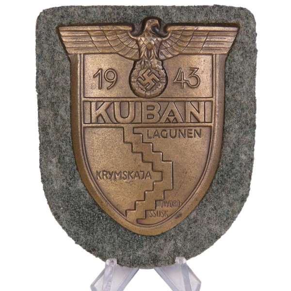 Kubanschild был учреждён 21 сентября 1943 года как награда для немецких военнослужащих, участвовавших в обороне Крымского перешейка и удержании Кубанского плацдарма. Щит вручался за участие в ожесточённых боях в регионе Тамани и служил символом личной доблести и упорства.