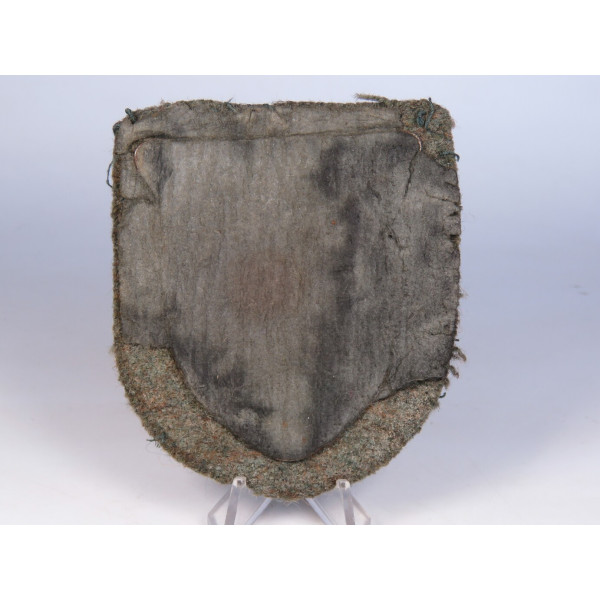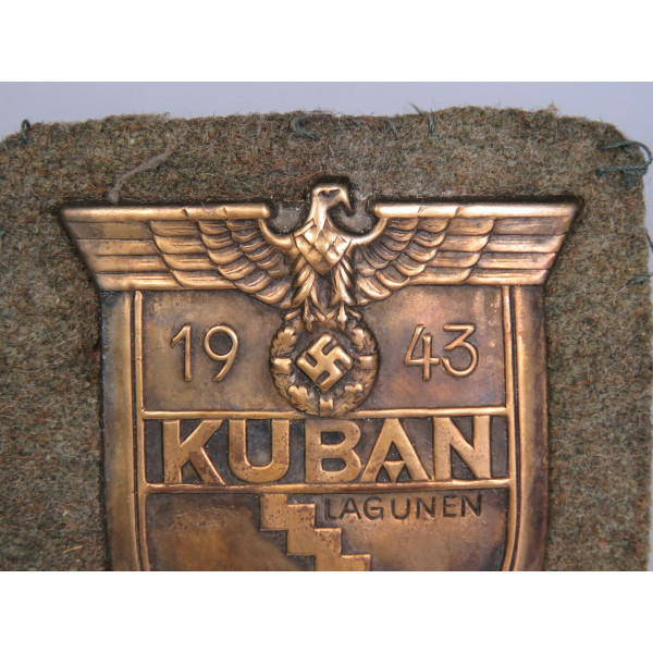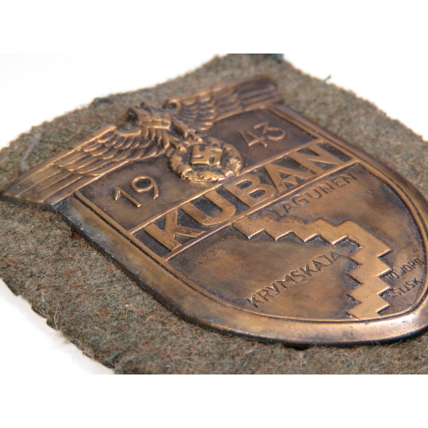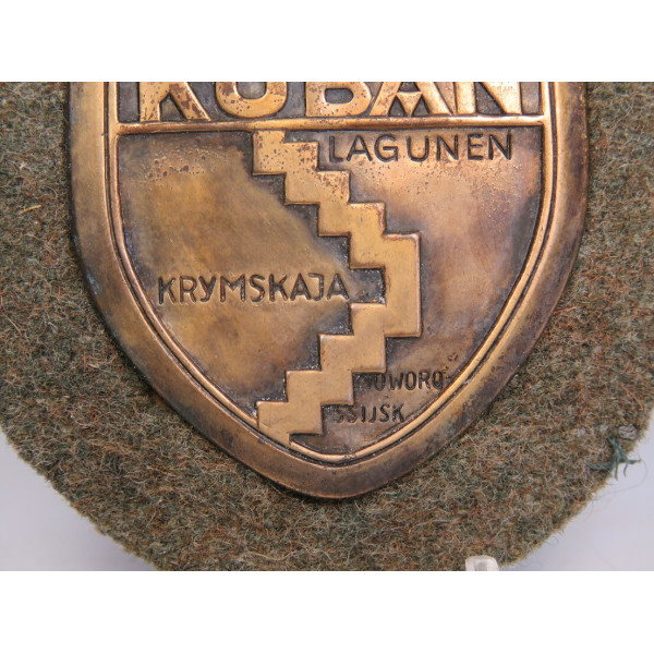 Нарукавный щит Кубань, известный среди коллекционеров как тип 5-2, с высокой вероятностью произведён фирмой Rudolf Karneth. Этот вариант всегда выполнен на одинаковой суконной подложке одного цвета с характерной бумажной обратной стороной, закрывающей металлическую пластину. Основа щита изготовлена из стали с латунным покрытием. Превосходное состояние.