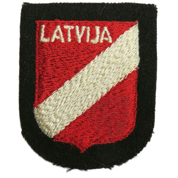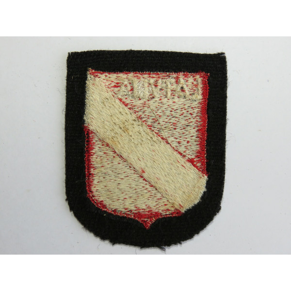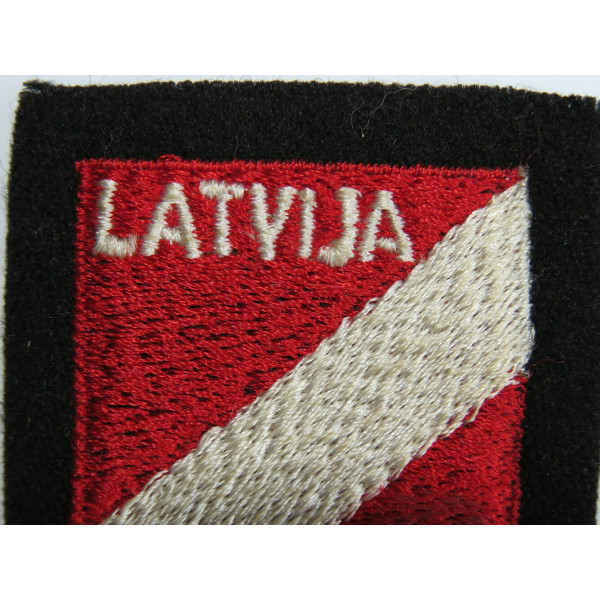 Нарукавный щит латышских легионеров Waffen-SS, 15-й или 19-й дивизий, так называемый тип Dachau. Выполнен в виде щита с диагональным красно-бело-красным флагом и надписью Latvija.