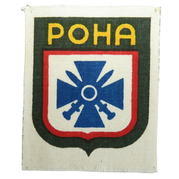 Крайне редкий нарукавный щит Русской Освободительной Народной Армии (РОНА) — формирования, созданного на основе оккупационной администрации Локотского округа и позднее включённого в состав войск СС. Данный тип щита был выполнен печатным способом и относится к периоду участия подразделений РОНА в подавлении Варшавского восстания летом 1944 года. Из-за стремительного развала формирования эти щиты практически не были использованы на униформе, что делает их исключительно редкими и высокоценимыми предметами в области сигноматики Третьего Рейха.