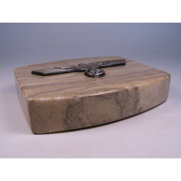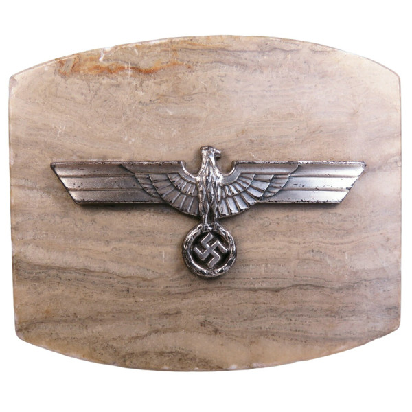Настольное декоративное изделие из натурального мрамора с установленным металлическим орлом Третьего Рейха. Орёл изготовлен из металла с серебристым покрытием и закреплён на массивной мраморной подставке. Типичный представитель кабинетных украшений периода Третьего Рейха. Состояние отличное, без повреждений.