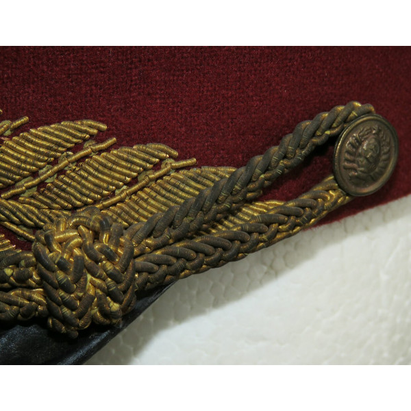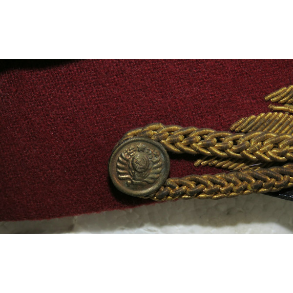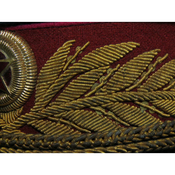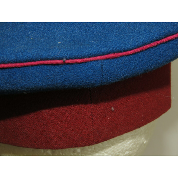 Парадная суконная фуражка существующей расцветки: васильковая тулья, краповый околыш с шитьём в виде лавровых ветвей на передней части, круглая генеральская кокарда установленного образца и филигранный шнур. Цвет шитья и филиграна соответствует цвету шитья на мундире. По верхнему краю околыша и тульи проходит кант малинового цвета.