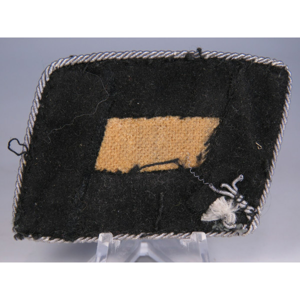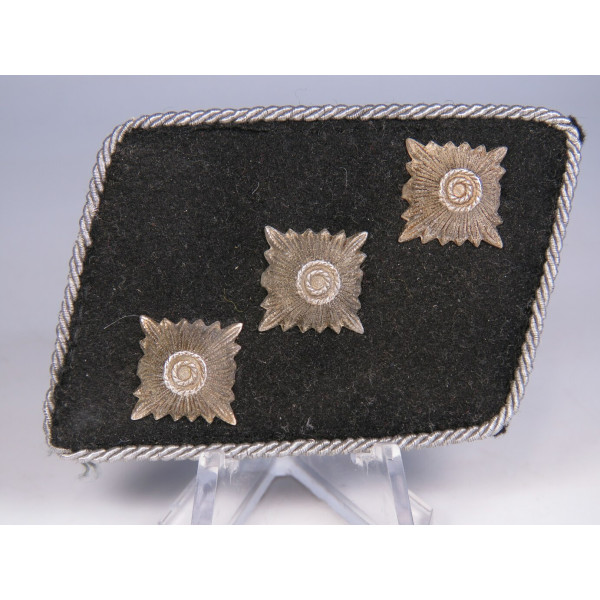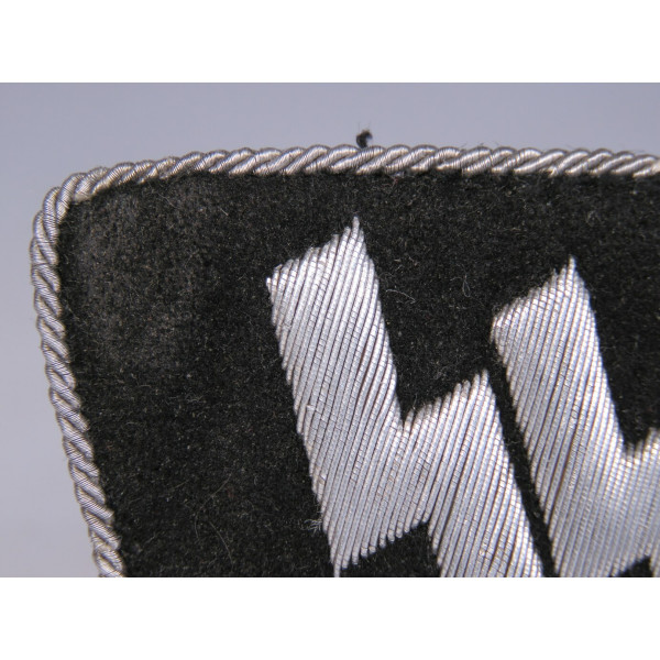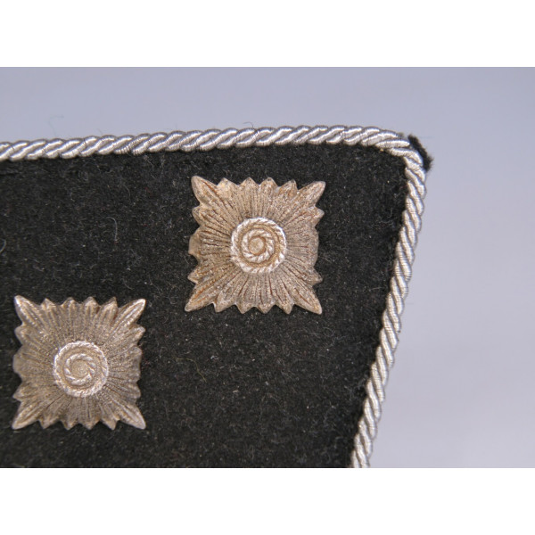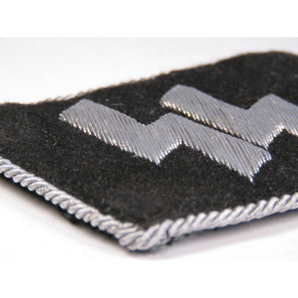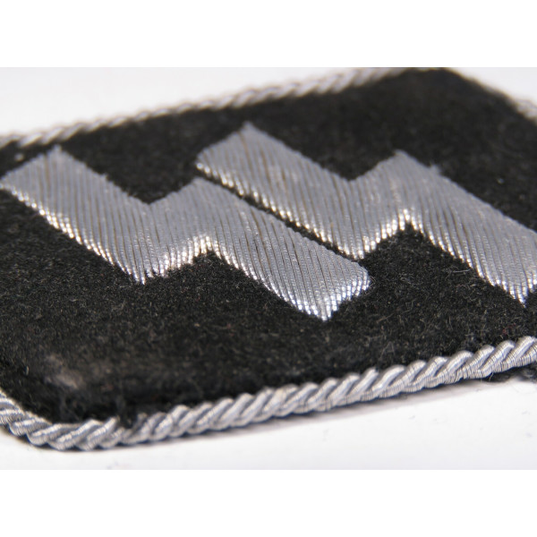 Парные петлицы СС для Унтерштурмфюрера, середина войны. Выполнены из молескинового материала, характерного для этого периода. Вышивка выполнена алюминиевой нитью, отличается превосходным качеством исполнения. Петлицы имеют лёгкие следы бытования и незначительные потёртости, однако находятся в превосходном состоянии.