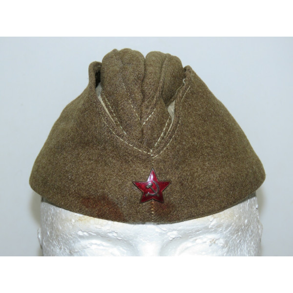 Пилотка образца 1935 года для нижнего состава РККА выполнена в середине войны из сукна цвета хаки представляет собой типичную фронтовую пилотку периода Великой Отечественной войны со всеми характерными особенностями имеет небольшое повреждение от ржавчины вероятнее всего оставленное звёздочкой а также несколько еле заметных мелких дырок размер ориентировочно 58–59