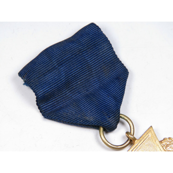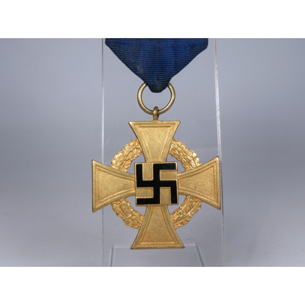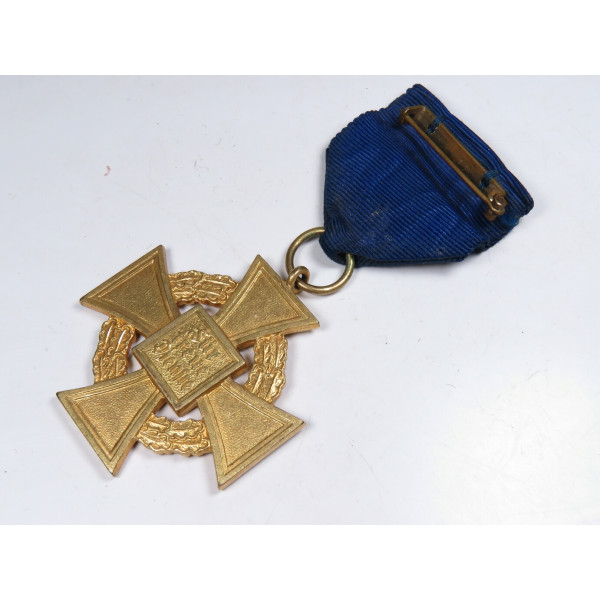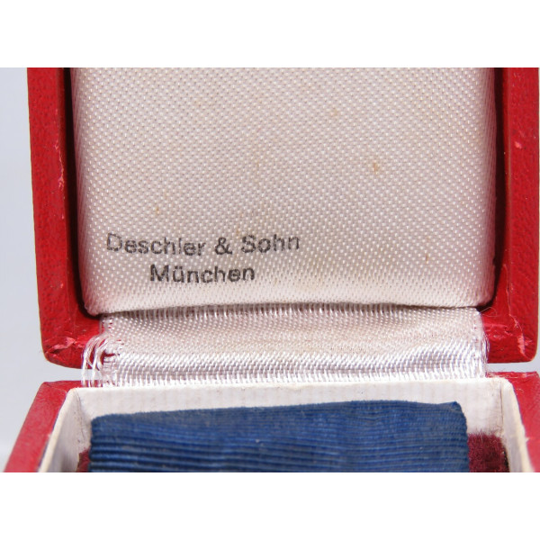 Награда Treudienst-Ehrenzeichen 1. Stufe, позолоченный бунтметалл с частичной эмалью, с центральной свастикой в чёрной эмали, на синей ленте с пришитой булавкой для ношения на груди, во футляре с тиснением Deschler & Sohn München