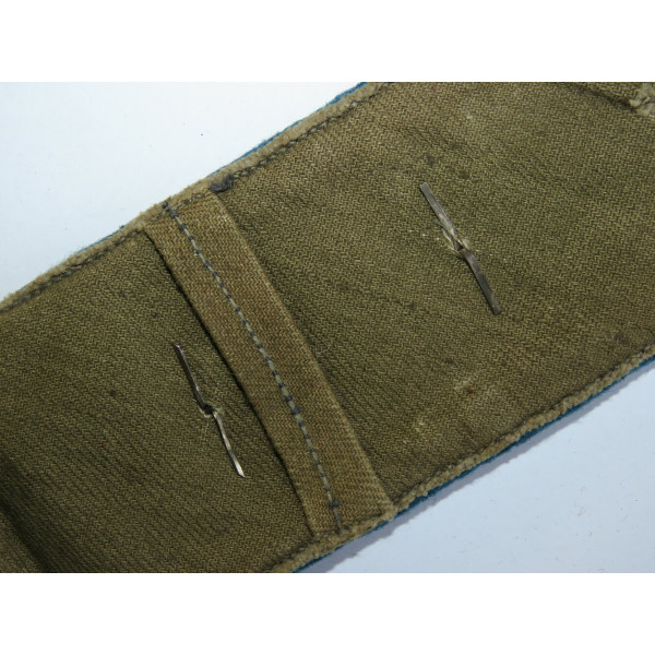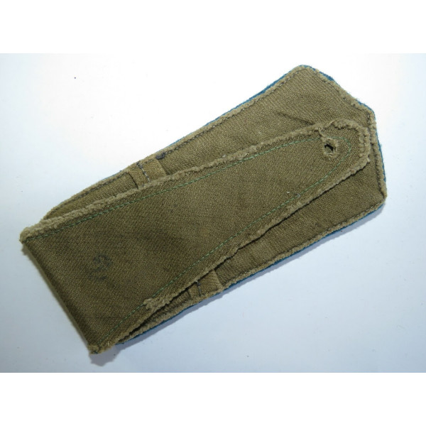 Полевой погон из сукна защитного цвета с двумя продольными малиновыми выпушками и голубым кантом. Установлены одна металлическая звезда и родовая эмблема авиации – винт с крыльями. Отличное состояние.