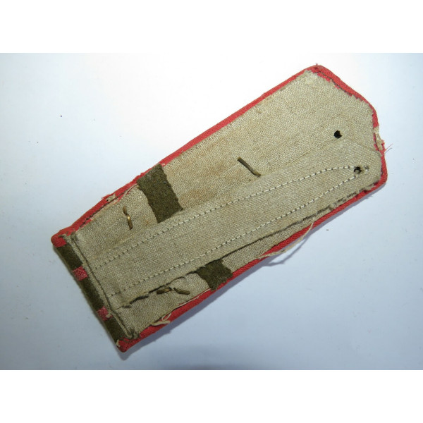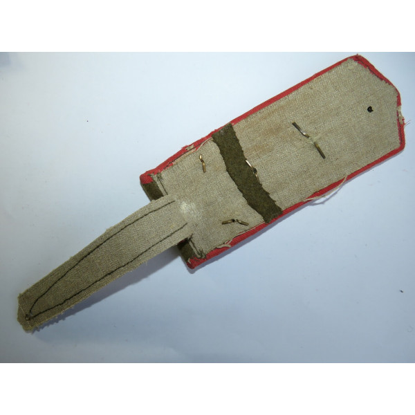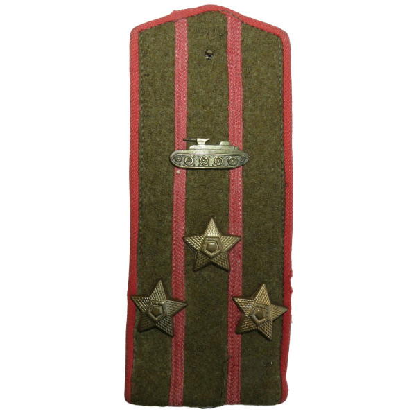 Полевой погон из шерстяного сукна защитного цвета с двумя продольными красными выпушками и окантовкой. Установлены три металлические звезды и родовая эмблема бронетанковых войск – танк. Отличное состояние.
