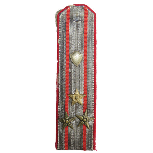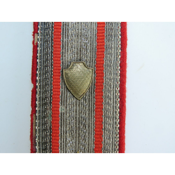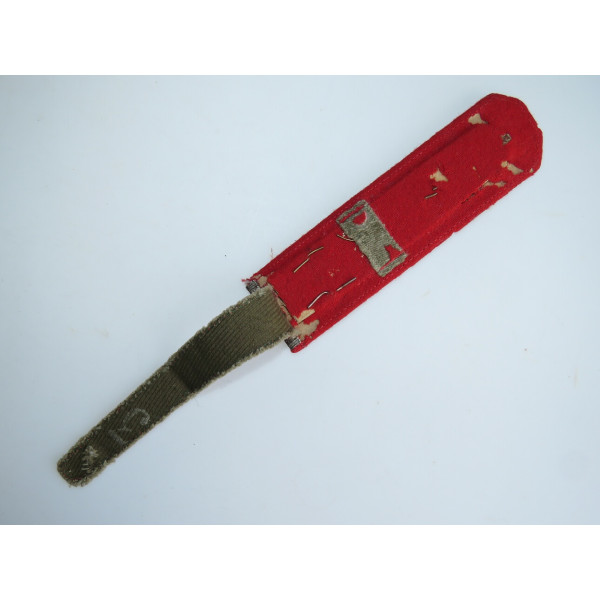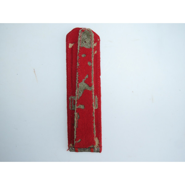 Погон старшего офицерского состава РКВМФ в чине полковника юстиции. Одиночный погон, выполнен из красного сукна с белым металлизированным галуном. На погоне установлена ранняя эмблема рода войск образца до 1935 года