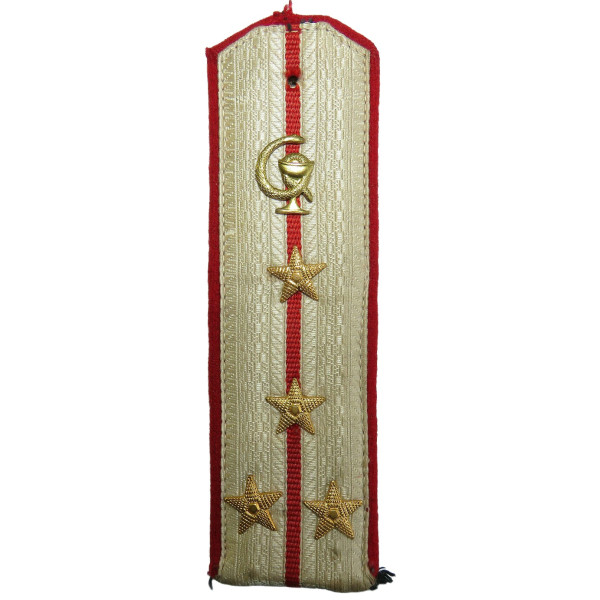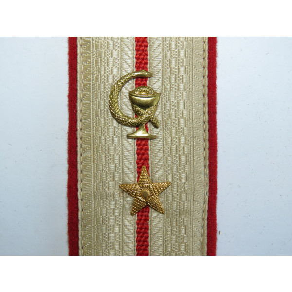 Узкий погон из белого шелкового галуна с красной продольной полосой и красным суконным подбоем. Установлены четыре металлические звезды и эмблема медицинской службы – чаша со змеёй. Предназначался для военврача 1 ранга без военно-медицинского образования. Отличное состояние.