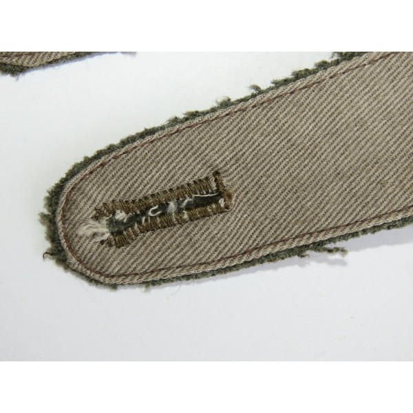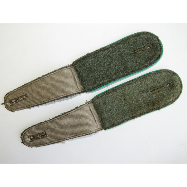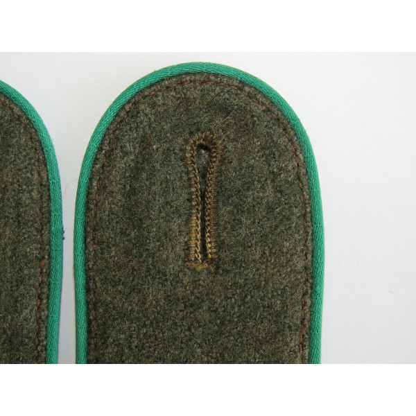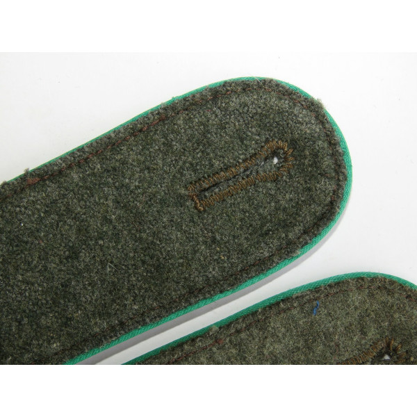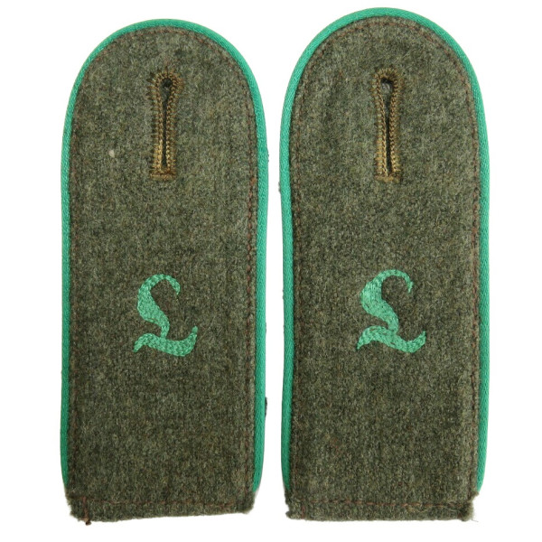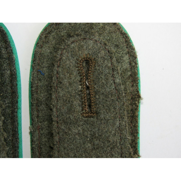 Крайне редкие погоны учебного подразделения горно-стрелковых войск вермахта — Gebirgsjäger Lehrabteilung. Шифровка «L» выполнена зелёной нитью цепным стежком. Поле сукна цвета Feldgrau, выпушка зелёного цвета. Отличное состояние, без утрат и повреждений.