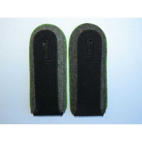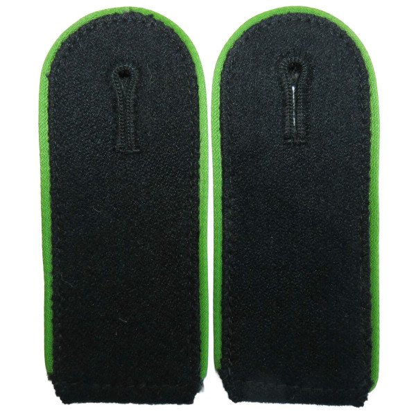 Пара погон Waffen-SS образца 1942 года для Schutzregimenter дивизии 4. SS-Polizei-Panzergrenadier-Division. Поле из чёрного сукна с выпушкой травянисто-зелёного цвета (Wiesengrün), характерного для полицейских подразделений. Оттенок сохранился ярким и насыщенным, без малейшего выцветания. Состояние минт – абсолютно без следов ношения.