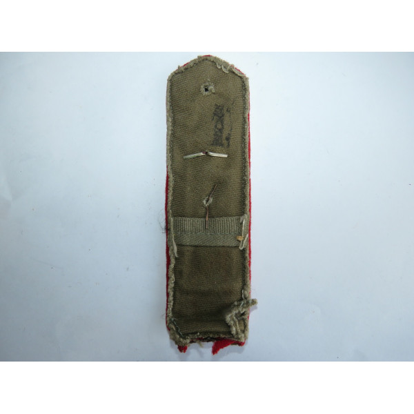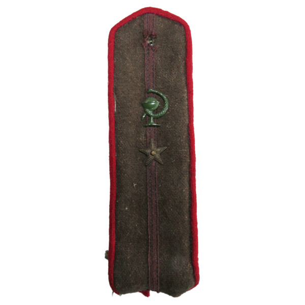 Погон младшего лейтенанта медицинской службы образца 1943 года. Выполнен из сукна с красной выпушкой по краю и коричневым просветом по центру. Установлена звезда среднего размера, положенная медицинскому персоналу, и окрашенная в зеленый цвет эмблема медицинской службы.