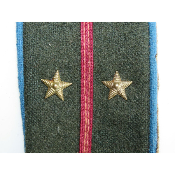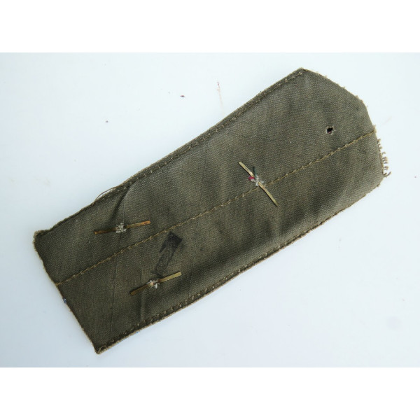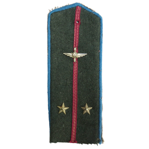 Погон образца 1943 года для полевого обмундирования авиации РККА. Выполнен из защитного сукна с голубой окантовкой и продольным малиновым кантом. На погоне установлены две металлические звезды золотистого цвета, соответствующие званию техника-лейтенанта. Эмблема техника авиации — крылья с пропеллером — закреплена неверно: она размещена на погоне для лётно-подъёмного состава, что указывает либо на использование в экспозиционных целях, либо на отсутствие у владельца правильного погона техники-лейтенанта. Состояние отличное