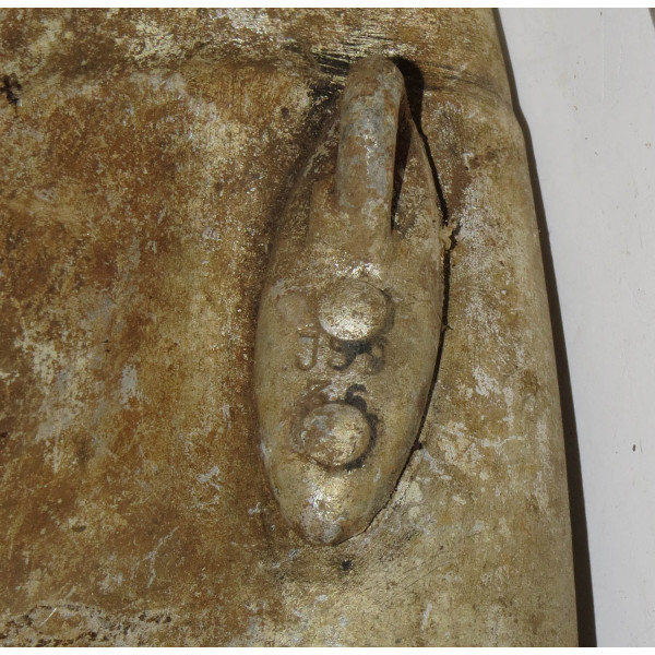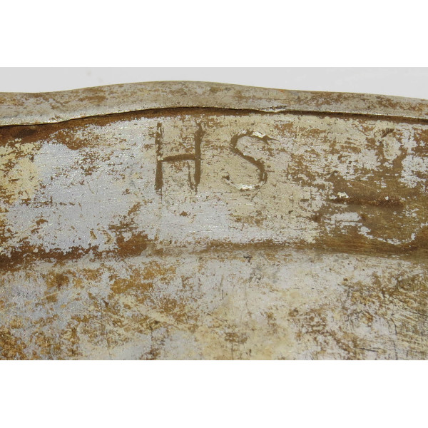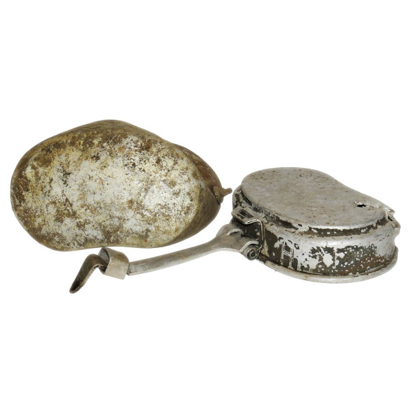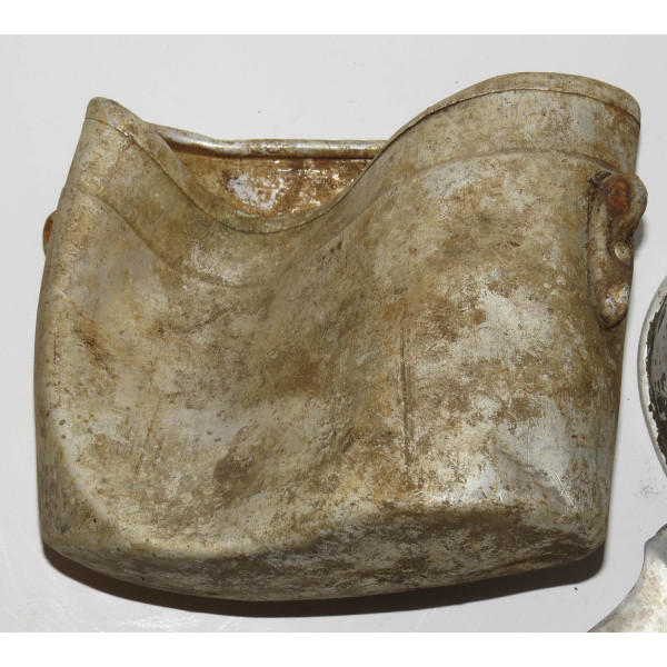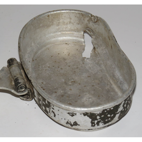Поврежденный в бою немецкий котелок из-под Ленинграда. На обеих частях имеется маркировка.