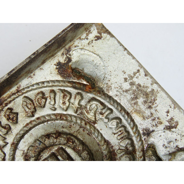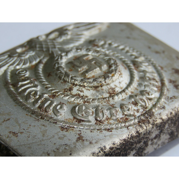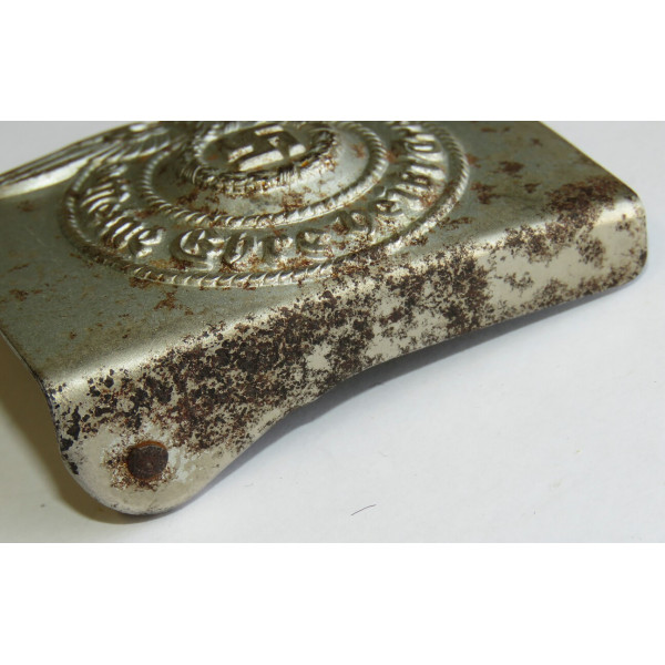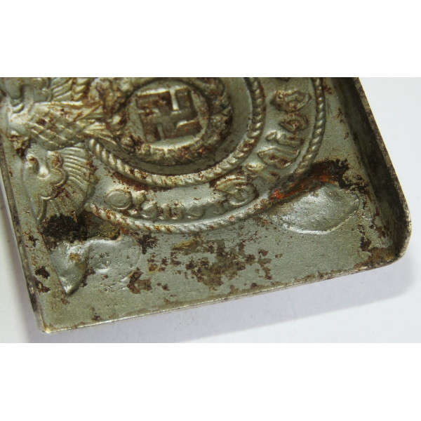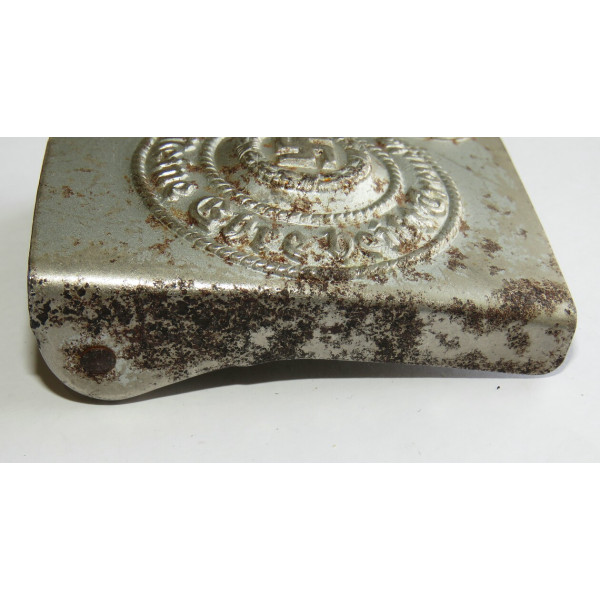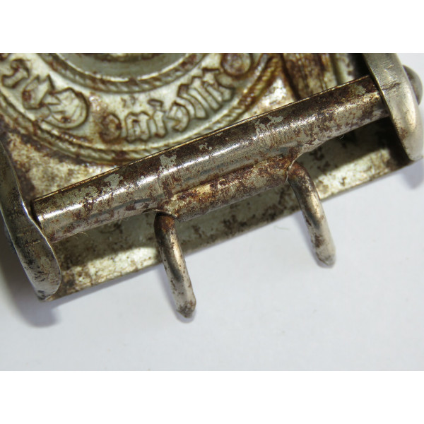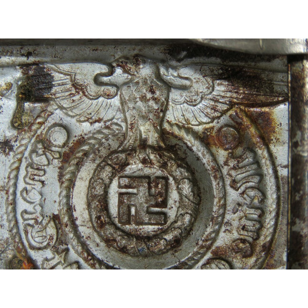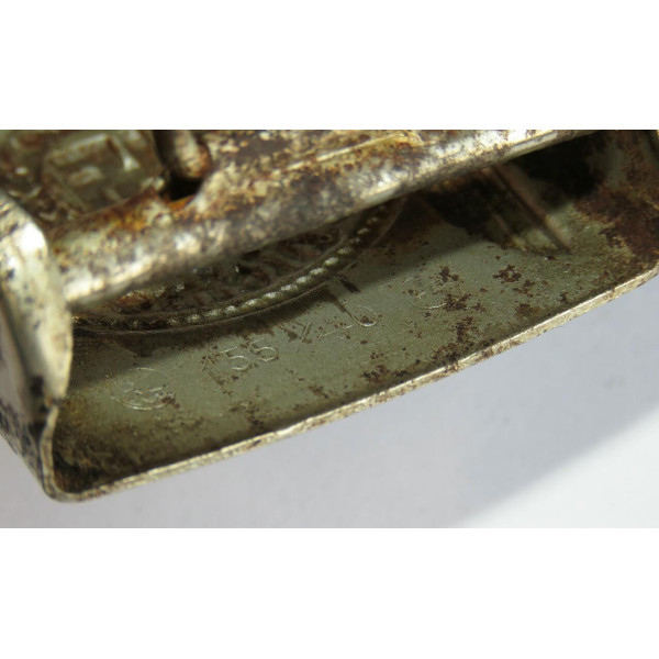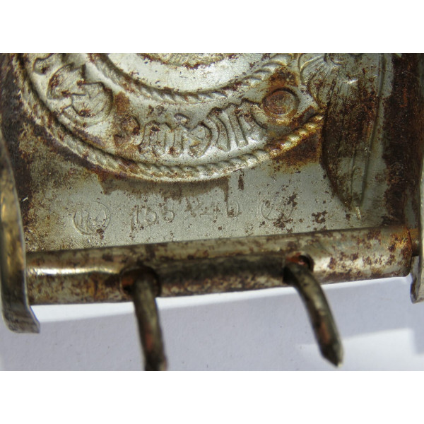 Одна из ранних стальных пряжек Ваффен-SS с маркировкой RZM 155/40 SS, соответствующей производителю Assmann & Söhne, Lüdenscheid. Относится к первым выпускам стальных пряжек, изначально покрытых никелем с последующим нанесением алюминиевой пудры под давлением.