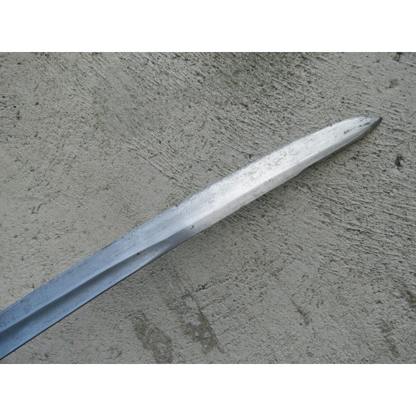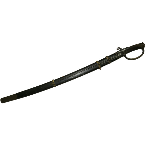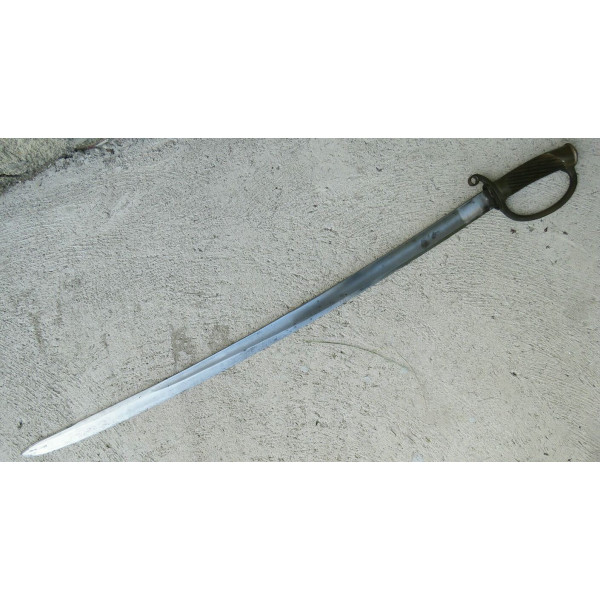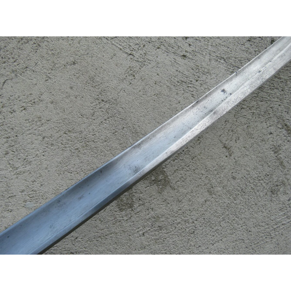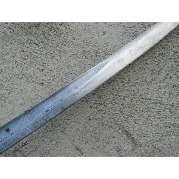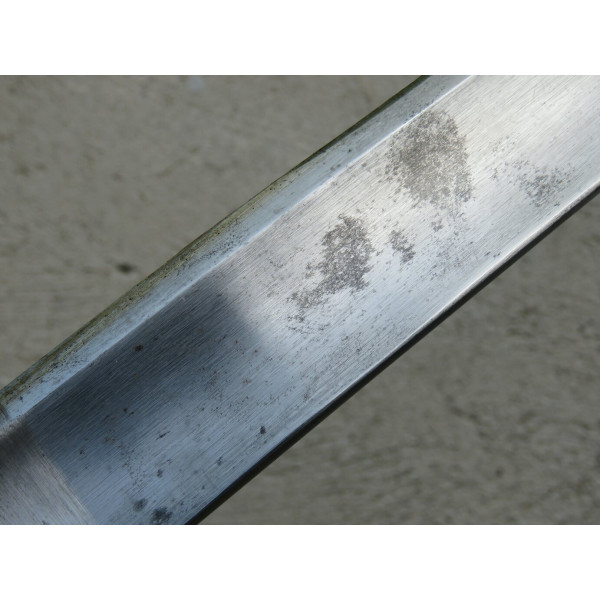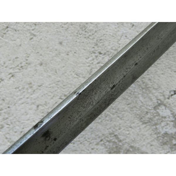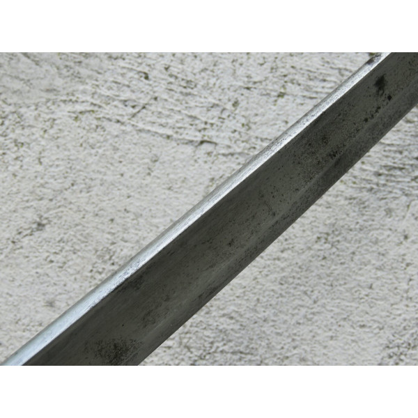Драгунская солдатская шашка образца 1881 года, изготовленная Златоустовской оружейной фабрикой в 1911 году. Клинок стальной, с односторонней заточкой, плавным изгибом и широким продольным долом, усиливающим прочность конструкции при сохранении гибкости. Следов заточки нет; на поверхности заметны лишь незначительные потемневшие участки без следов ржавчины или каверн.