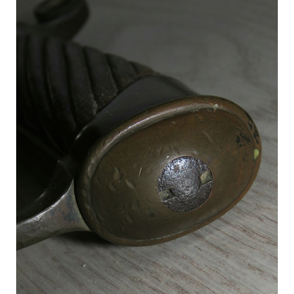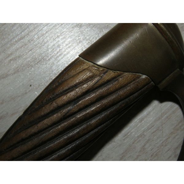 Эфес состоит из латунной головки и плавно изогнутой крестовины с округлым концом. Рукоять деревянная, оформлена диагональными рифлёными канавками, обеспечивающими надёжный хват и выразительный внешний вид.
