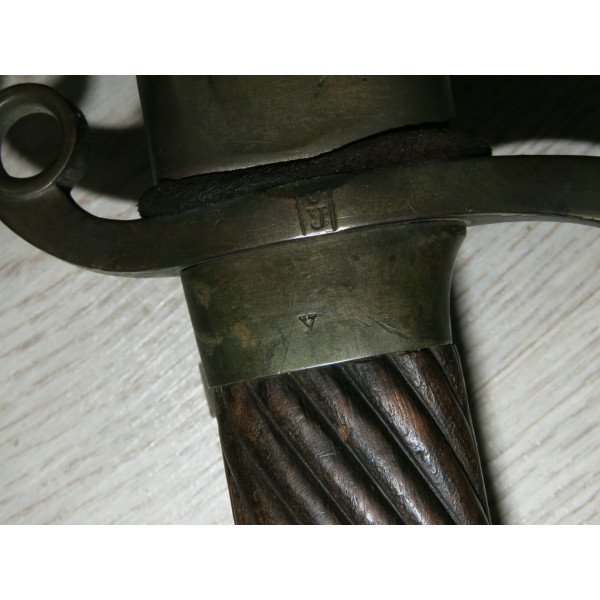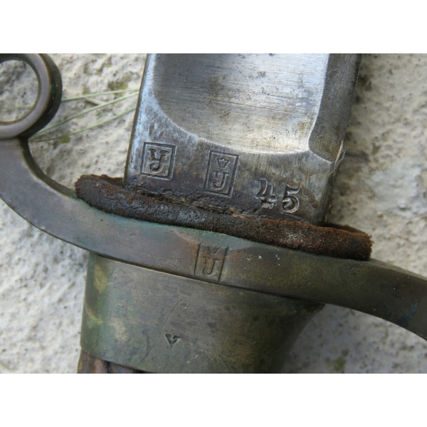 С обратной стороны клинка находятся два инспекционных клейма: квадрат с литерой «У», а также прямоугольник с той же буквой, над которым расположена корона и справа выбит номер 45.