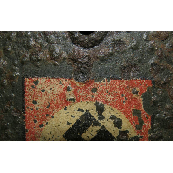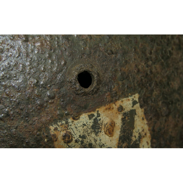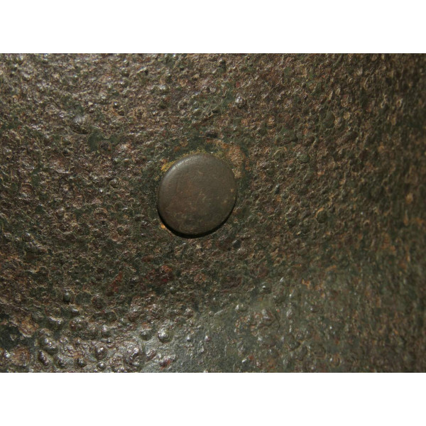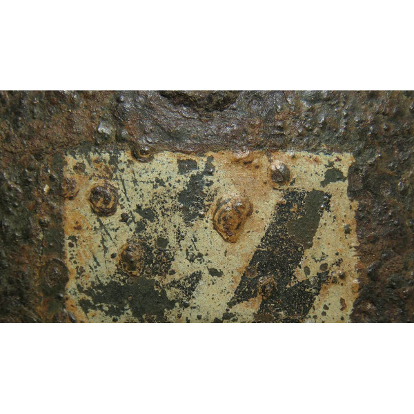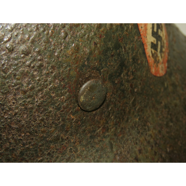 Двухдекальный шлем M35, найден на позициях дивизии SS-Totenkopfverbände в районе Демянска около двадцати лет назад. Имеет археологическое происхождение и находится в практически нечищенном состоянии. На поверхности — неплотный слой ржавчины, под которым местами сохраняется оригинальная заводская краска; при использовании электролиза возможно значительное раскрытие покрытия. Обе декали различимы и соответствуют раннему типу нанесения СС.