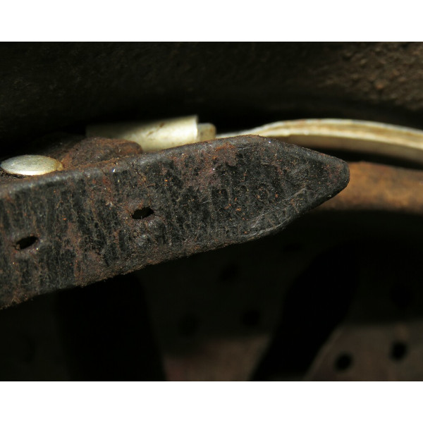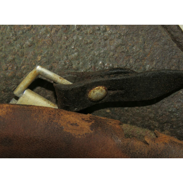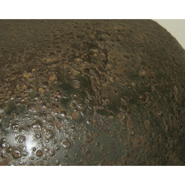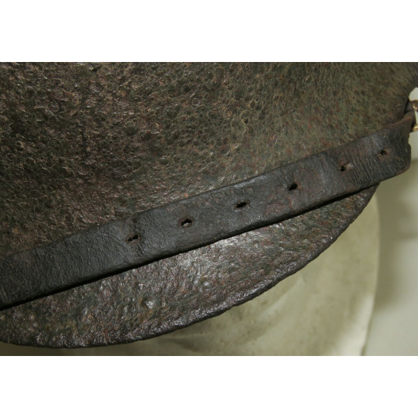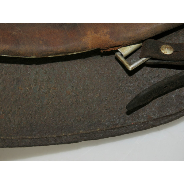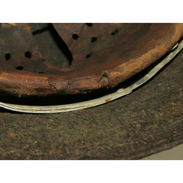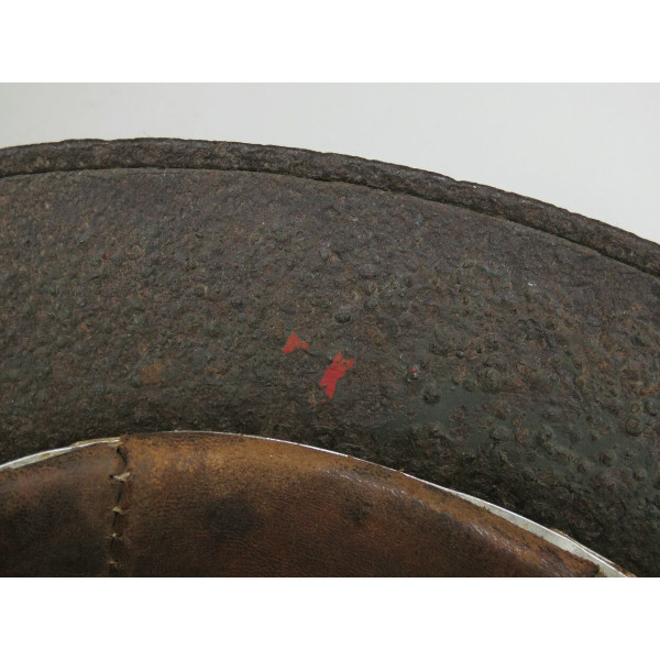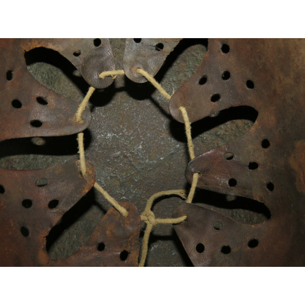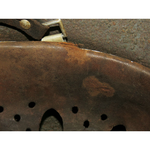Маркировка, вероятно, ET, расположена на внутренней правой стороне купола, но не читается из-за коррозии. Размер корпуса — 68, подшлемника — 60–61. Подшлемник, предположительно, был снят для очистки и установлен обратно. Кожа мягкая и хорошо сохранившаяся.