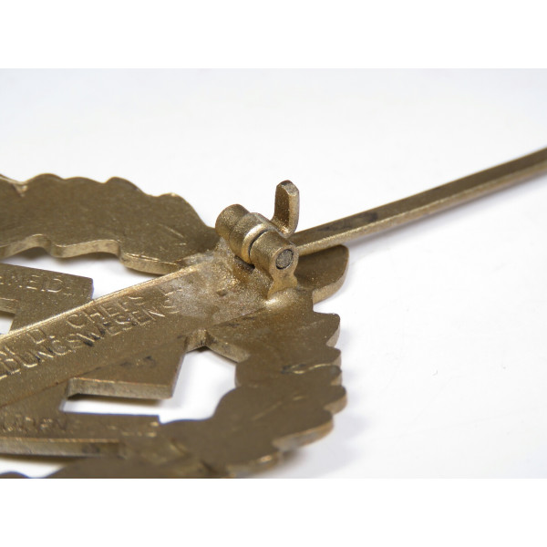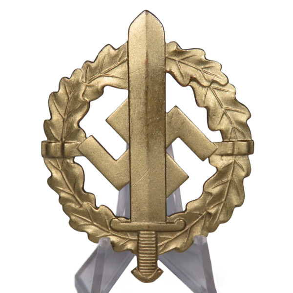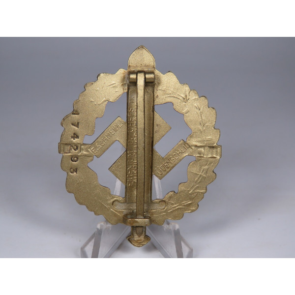 Бронзовый SA-Sportabzeichen производства E. Schneider из города Люденшайд выполнен из бунтметалла с матовым покрытием золотистой пудрой под давлением мы предполагаем что знак бронзовой степени несмотря на его золотистый внешний вид состояние близко к идеальному фактически минт имеется лишь небольшая потертость на центральной части меча на реверсе нанесена маркировка 174293 E. Schneider Ludenscheid Eigentum d. Chefs u. Ausbildungswesens рельеф чёткий покрытие сохранено общее состояние превосходное
