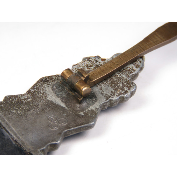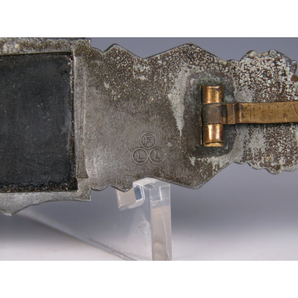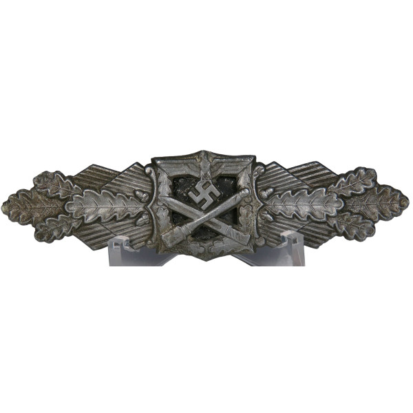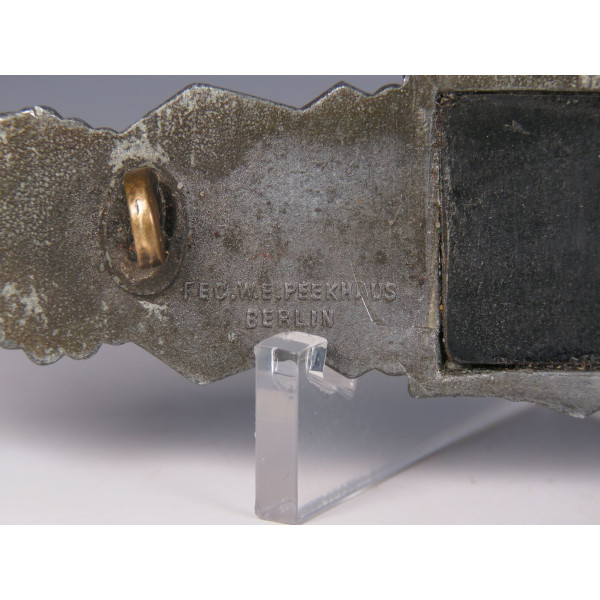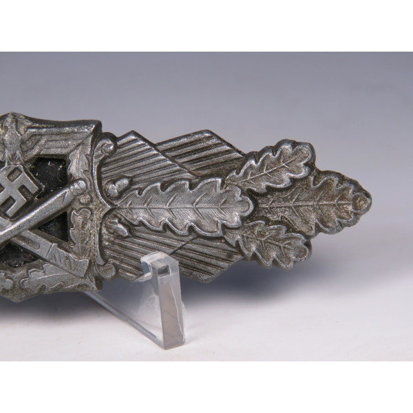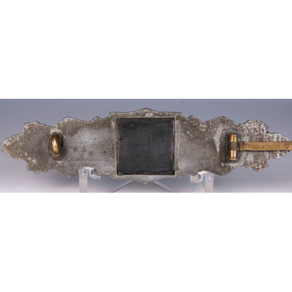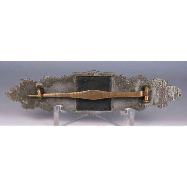 Оригинальная шпанга за ближний бой (Nahkampfspange) бронзовой степени. Изготовлена из цинка, производитель — Friedrich Linden, Lüdenscheid. Бронзовое покрытие частично утрачено в результате естественного взаимодействия с основным металлом, что характерно для поздних цинковых изделий. Имеются следы бытования, включая небольшое повреждение от окисления на одном из дубовых листьев. На реверсе — клеймо FLL в кольцах и надпись FEC. W. E. PEEKHAUS BERLIN, указывающая на дизайнера. Полностью оригинальный экземпляр с рабочей застёжкой