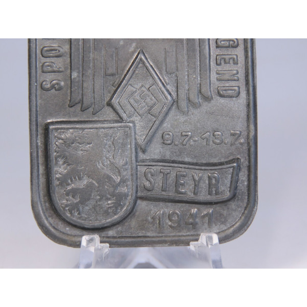 Оригинальный значок Sporttage der Jugend Oberdonau Steyr 1941, изготовленный из цинка. Выпущен по случаю проведения спортивных соревнований Гитлерюгенда в городе Штейр с 9 по 13 июля 1941 года в регионе Обердонау (Верхний Дунай). Композиция включает изображение национального орла с надписью "Ober Donau", ромбовую эмблему Гитлерюгенда в центре и герб города Штейр в нижней части.