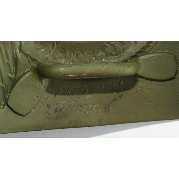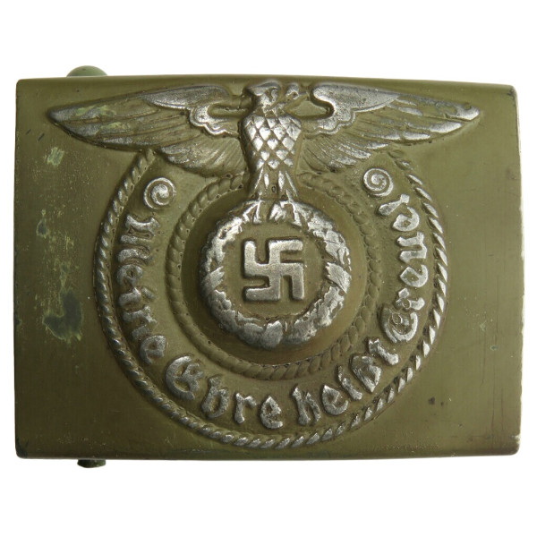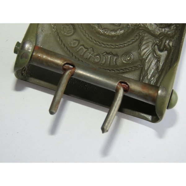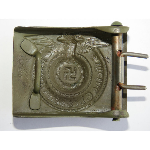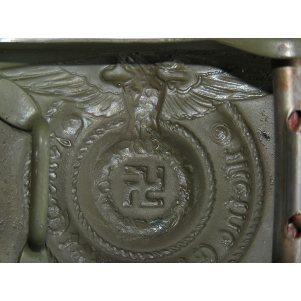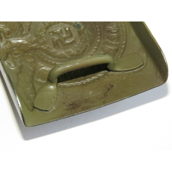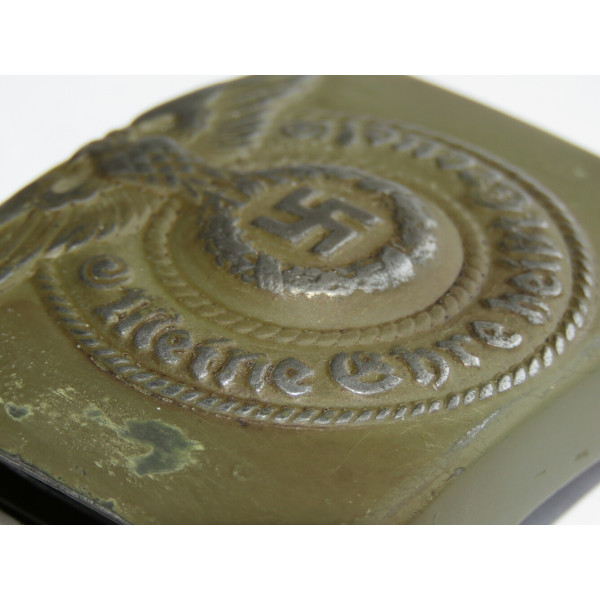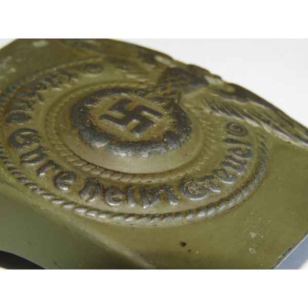 Стальная пряжка Ваффен-СС, изготовленная фирмой RODO, выполнена из стали и покрыта краской защитного цвета. Поверхность сохранила окрас с естественными следами бытования, без критических повреждений.