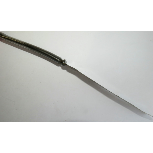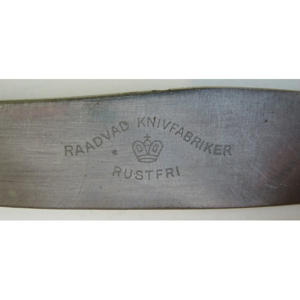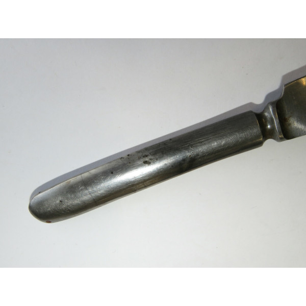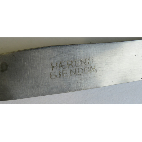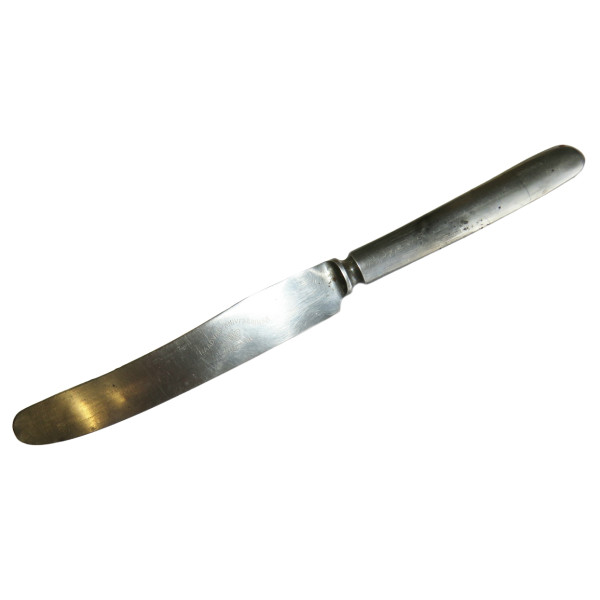 Столовый армейский нож, найденный на позициях 24-го полка Waffen-SS "Danmark" под Синемяэ. На ноже имеются характерные повреждения от взрыва. Интересный предмет, сохранивший следы боевых действий, связанных с ожесточёнными боями в этом районе.