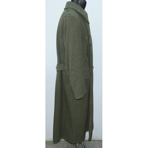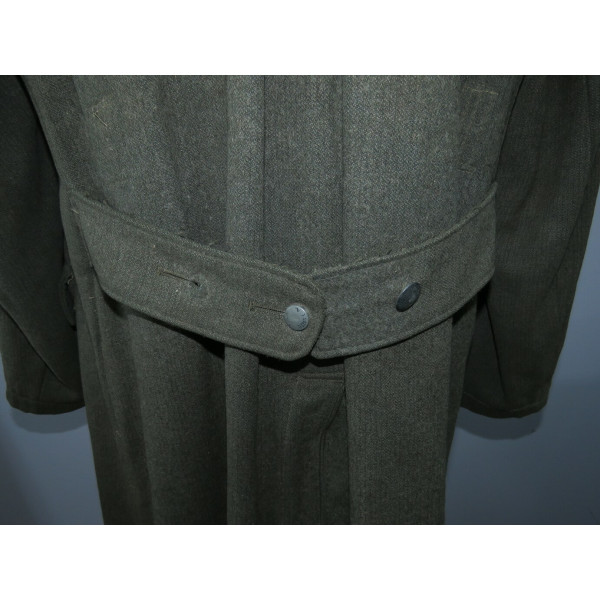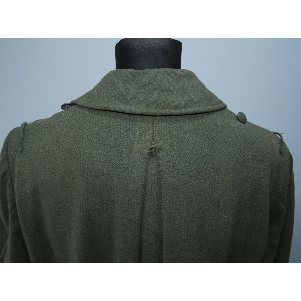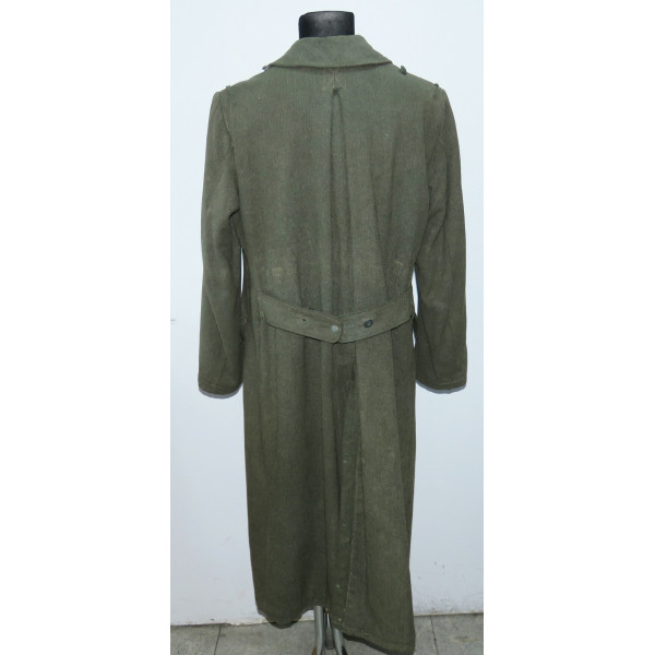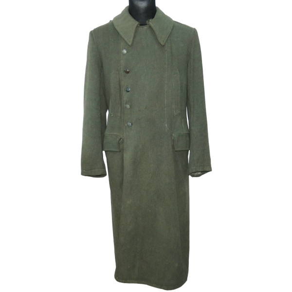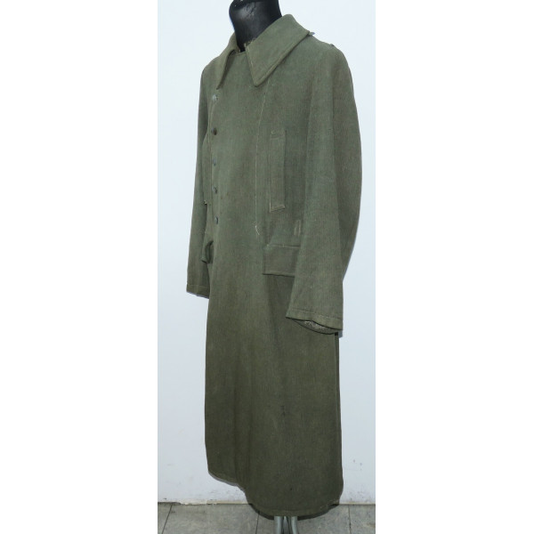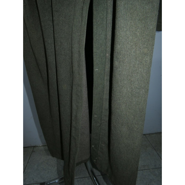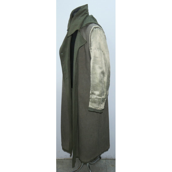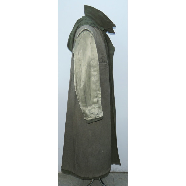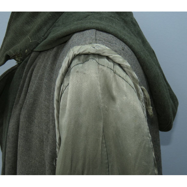 Шинель Waffen-SS выпуска последних месяцев войны, изготовленная из удешевлённого материала с высоким содержанием хлопка и грубым плетением, характерным для этого периода. Модель с капюшоном, сохранившая сильные следы фронтового бытования. На груди заметны следы многократного перешива пуговиц, погонные шлейки пришиты в заводском исполнении.