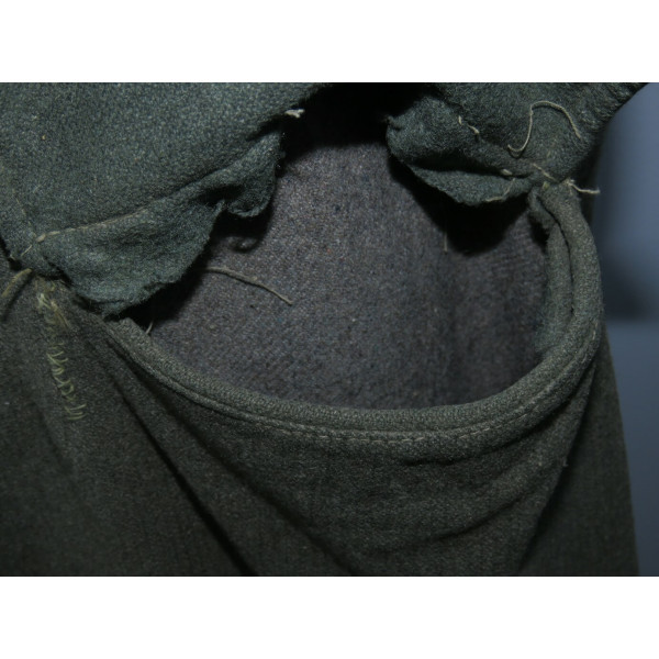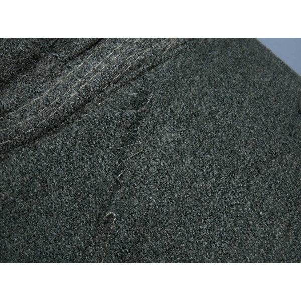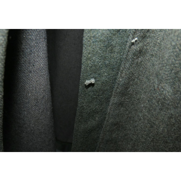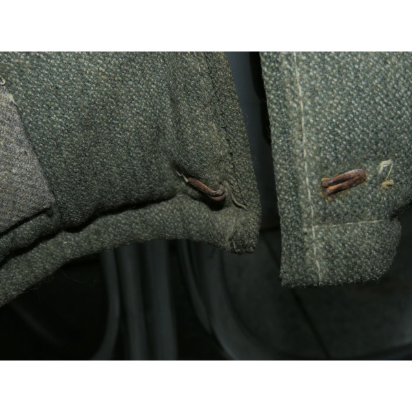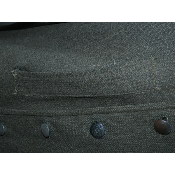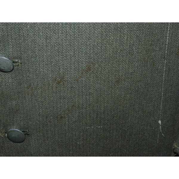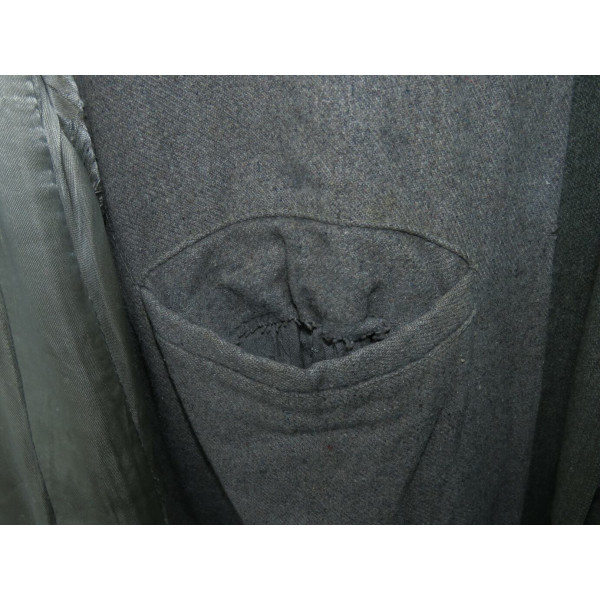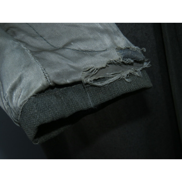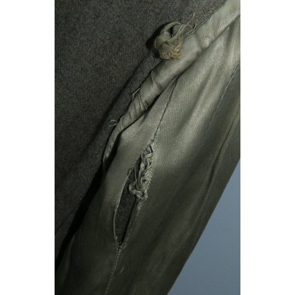 Имеется порыв около 10–15 см, который легко устранить без влияния на внешний вид. Отсутствуют два внутренних кармана — правый нагрудный и левый нижний — что связано с износом, но эти утраты никак не отражаются на общем виде и на манекене остаются незаметными. На левой стороне отсутствуют пуговицы, при необходимости можно дополнить комплект оригинальными. В целом шинель сохранилась в превосходном состоянии, с подлинным антуражем последних месяцев войны.