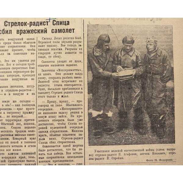 Подпись под фотографией: «Участники великой отечественной войны (слева направо): стрелок-радист П. Агафонов, летчик Николаев, стрелок-радист В. Строков.»