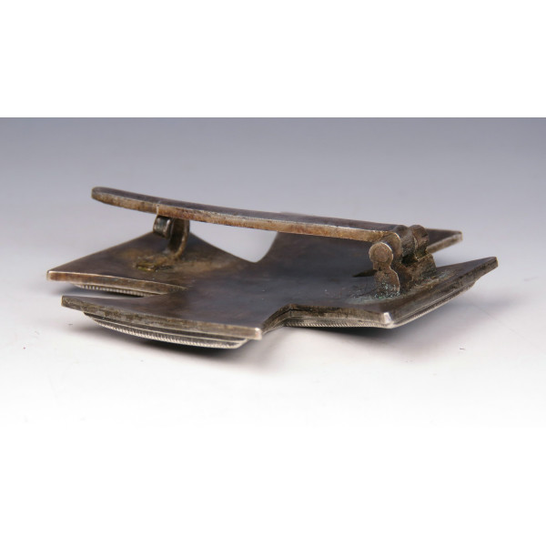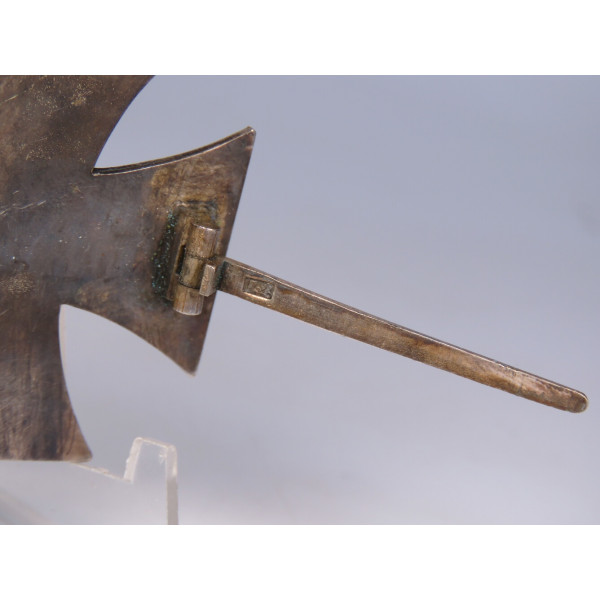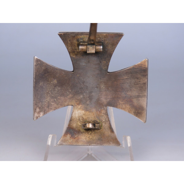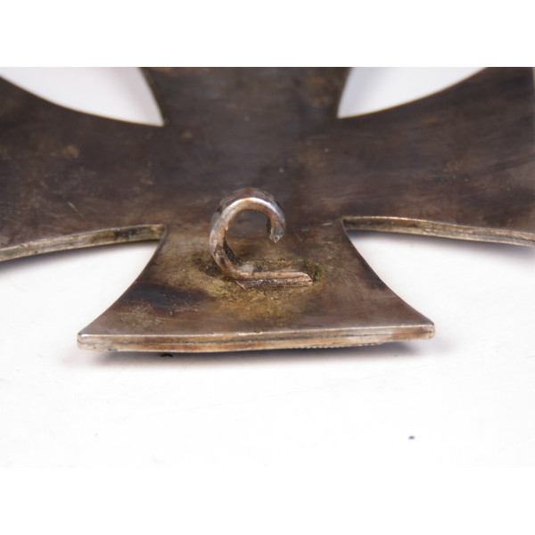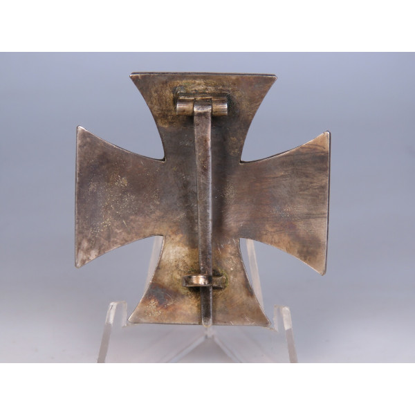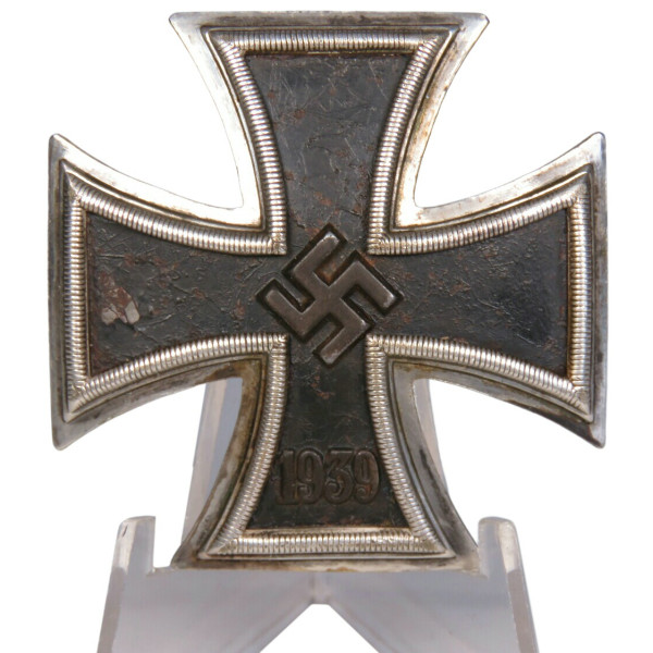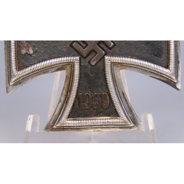 Железный крест 1-го класса образца 1939 года, с маркировкой L/52 Carl Friedrich Zimmermann, Pforzheim (штамп на обороте под иглой). Сердцевина креста изготовлена из стали, лакокрасочное покрытие имеет лёгкую паутинку ржавчины, что придаёт предмету антуражный вид. Крест выполнен в выпуклой форме для эффектного вида на униформе. Есть следы бытования. Очень выразительный, коллекционно привлекательный экземпляр.