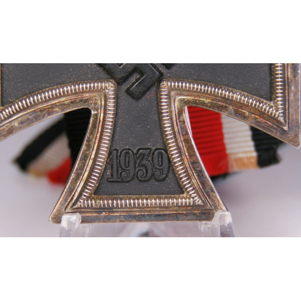 Железный крест 2 класса (Eisernes Kreuz II. Klasse) без клейма производителя. Состояние превосходное: чёрное лакокрасочное покрытие полностью сохранено, присутствует лёгкая благородная патина на серебристой рамке. Классическая трёхсоставная конструкция с магнитной сердцевиной, характерная для периода Второй мировой войны.