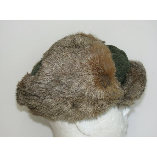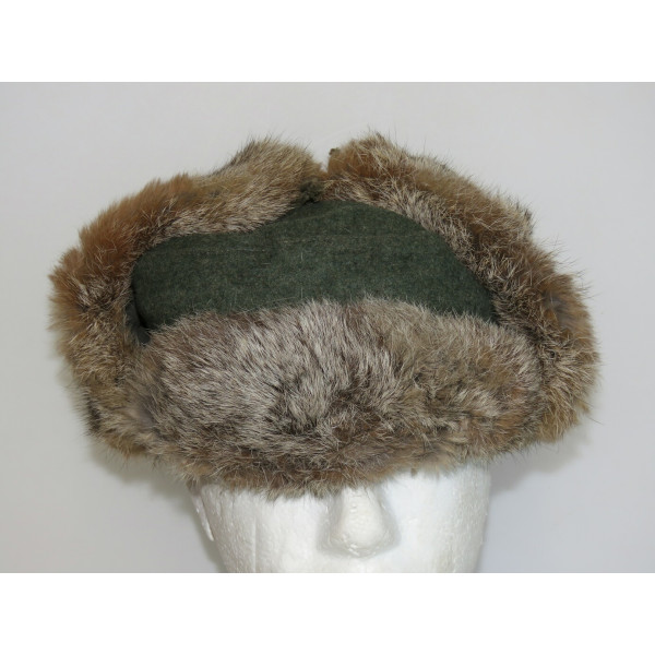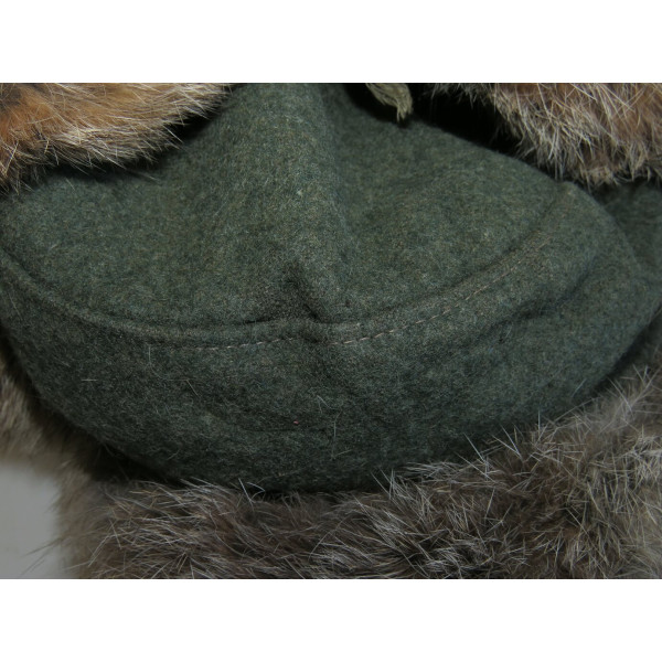 Зимняя меховая шапка крупного 62 размера, использовавшаяся в вермахте и Ваффен СС. Имеется ручная прошивка по задней части тульи и на подкладке — вероятно, попытка уменьшить размер. Актуальная посадка — около 60–61. Имеются следы бытования.