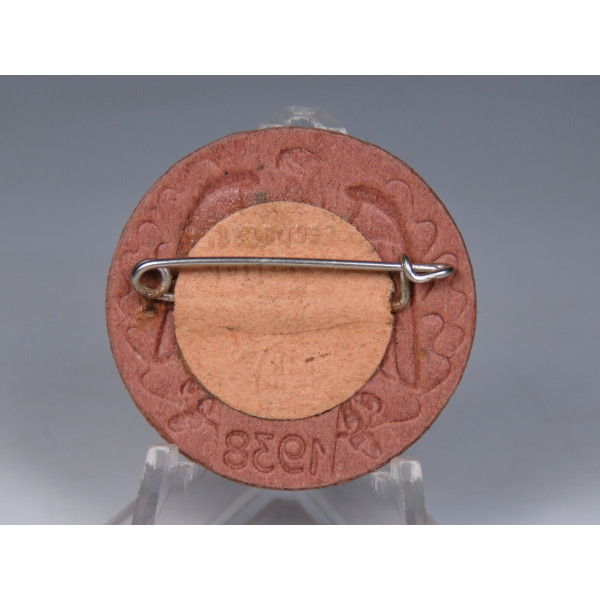 Картонный значок 1938 года, изготовленный для массовых мероприятий Гитлерюгенд. На аверсе изображён орёл с распростёртыми крыльями, держащий ромб с эмблемой Гитлерюгенд и свастикой в центре. В нижней части дата «1938». Материал – прессованный картон красного цвета. Состояние со следами времени, но с хорошо читаемыми деталями.