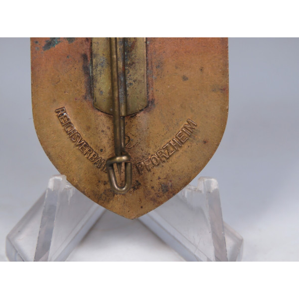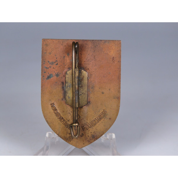 Знак участника соревнований 1937 года, проводимых в рамках профессиональной подготовки немецкой молодежи рейха. Щит с рельефным ромбом Hitlerjugend и вписанной свастикой в центре, по краям надпись «Reichs-Berufs-Wettkampf der deutschen Jugend 1937». В нижней части буквы «D A F», указывающие на участие Немецкого трудового фронта в организации мероприятия. Знак выполнен из меди, на реверсе имеется клеймо «REICHSverband PFORZHEIM». Состояние отличное, со следами бытования.