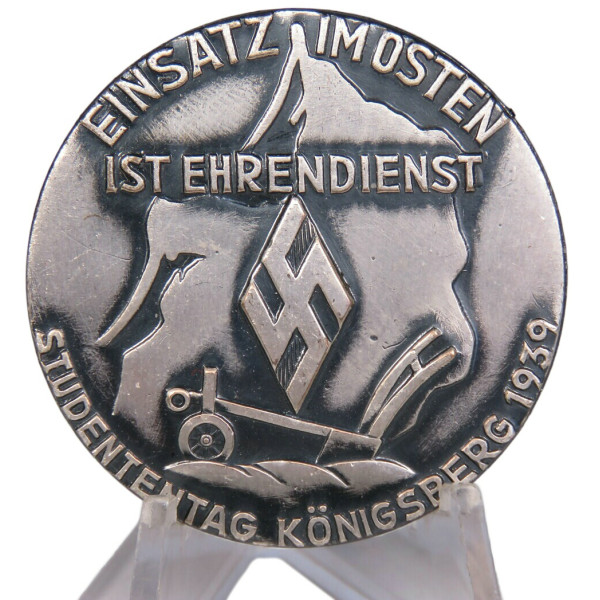 Знак участника студенческого дня в Кёнигсберге 1939 года, с надписью «Einsatz im Osten ist Ehrendienst» — «Труд на Востоке — это почётная служба». На аверсе изображён профиль карты Восточной Пруссии, эмблема и плуг. Знак изготовлен методом штамповки из CupAl (алюминий с медной фольгой), сверху серебрение с характерным чёрнением-тонировкой на рельефах. Превосходное коллекционное состояние.