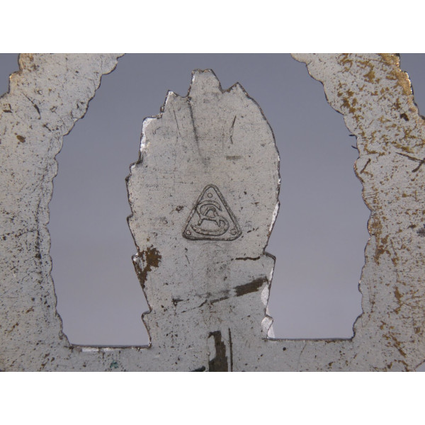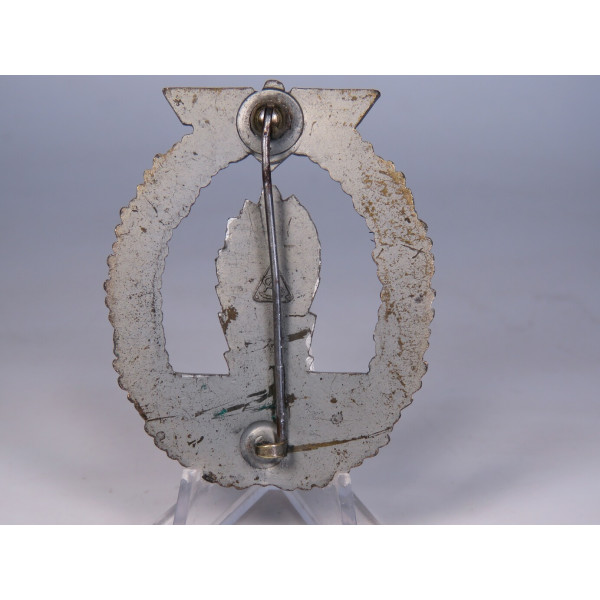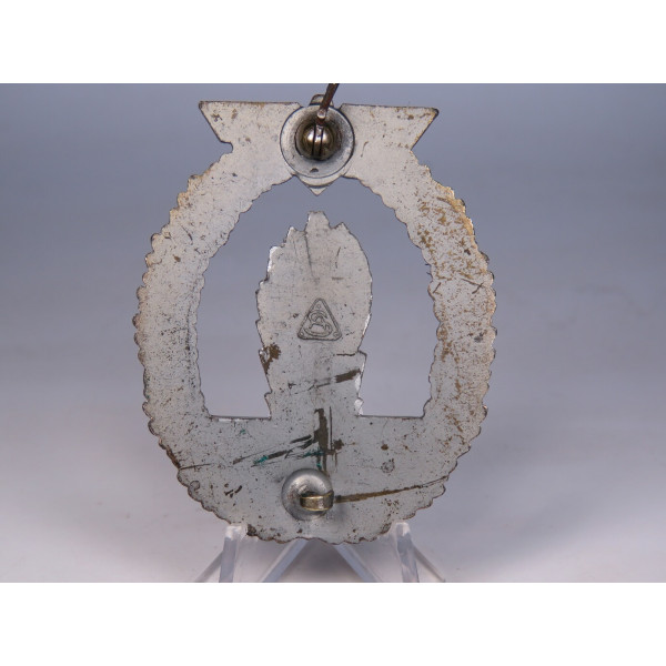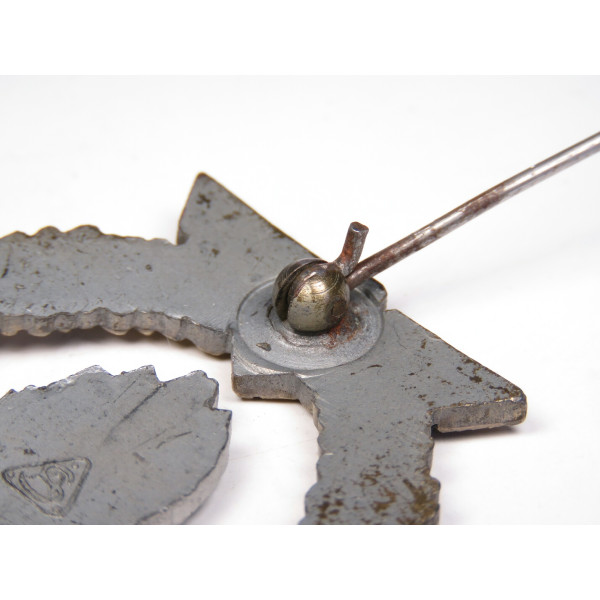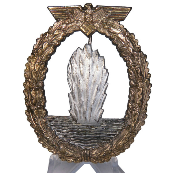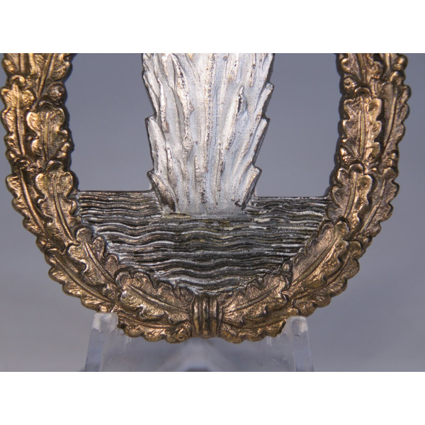 Оригинальный знак тральщика (Minensucher-Kriegsabzeichen), вручавшийся личному составу Кригсмарине за участие в операциях по тралению и обеспечению минной безопасности. Изготовлен из цинка, производитель — Adolf Scholze, Grünwald, с клеймом в виде треугольника на реверсе. Тыльная сторона покрыта матовым серебристым слоем. Аверс в превосходном состоянии: серебристый взрыв волны ярко выделяется на фоне чёрных волн, венок полностью сохранил бронзовое покрытие. Детализация чёткая и выразительная. Шарнир и крепление в отличном состоянии, функционируют.