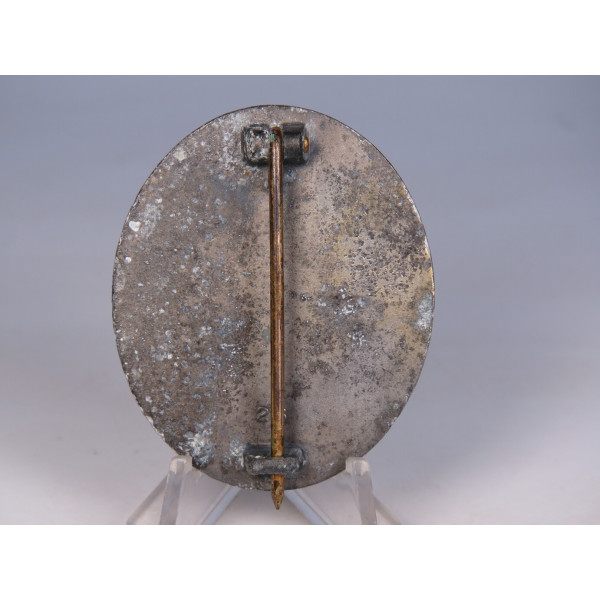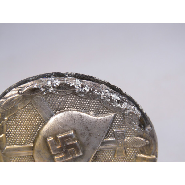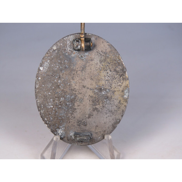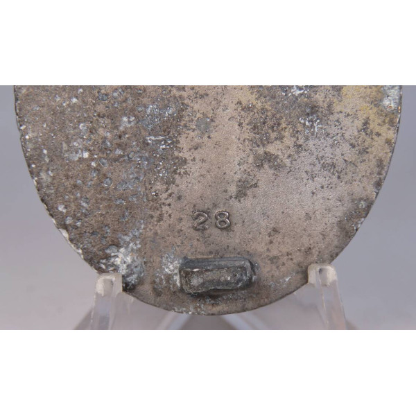 Знак Verwundetenabzeichen 1939 в золотой степени, изготовлен из цинка с золочением. Производитель — PKZ 28, Eugen Schmidthäußer, Pforzheim. Аббревиатура PKZ расшифровывается как Präsidialkanzlei — наградной отдел Рейха. Золотое покрытие практически полностью диффундировало в цинковую основу. Состояние среднее.