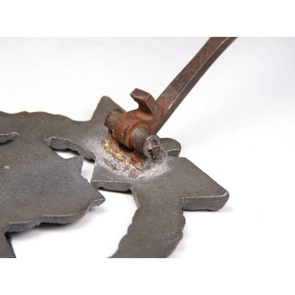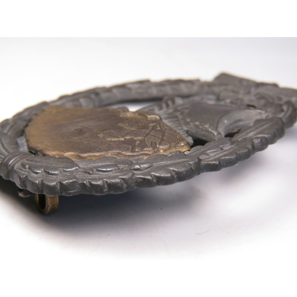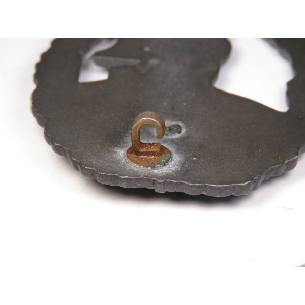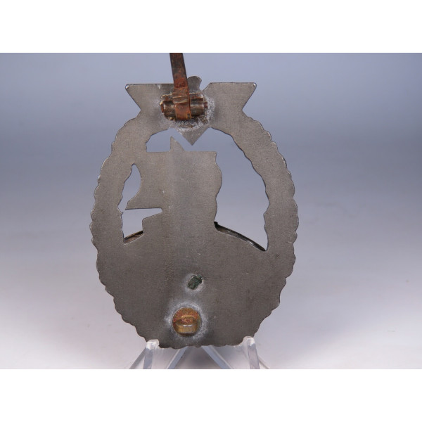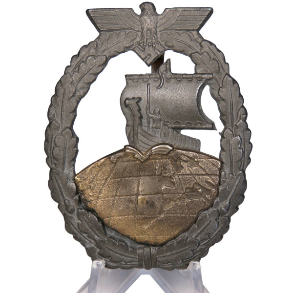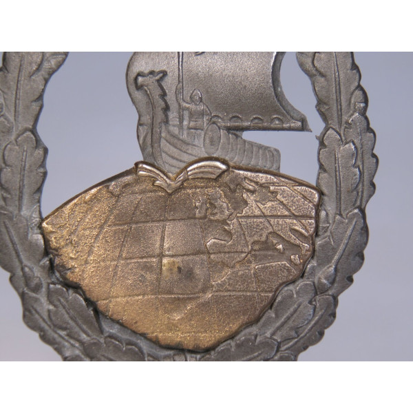 Оригинальный знак за участие в морских операциях вспомогательных крейсеров (Hilfskreuzer) Кригсмарине, учреждённый 24 апреля 1941 года. Представленный экземпляр — позднего военного производства из цинка, изготовленный фирмой Steinhauer & Lück, Lüdenscheid. Характерен умеренно низкий уровень детализации, типичный для позднего выпуска, однако знак находится в идеальном состоянии. Серебристо-серое покрытие на венке и паруснике полностью сохранено, бронзовое покрытие на глобусе выражено частично. На реверсе — оригинальное крепление с прямоугольной проушиной, аналогичное применяемым на поздних знаках St&L. Отличный образец с хорошо читаемым рельефом и полной сохранностью всех элементов.
