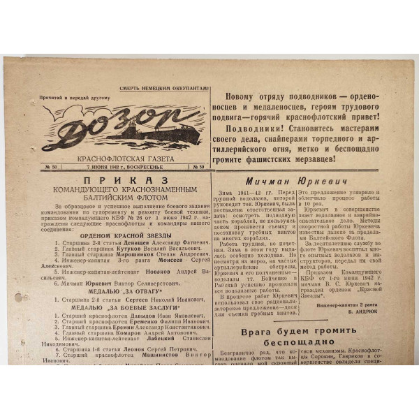 An extremely rare issue of the frontline newspaper Dozor, No. 50, dated June 7, 1942 — a publication created specifically for submariners of the Red Banner Baltic Fleet. It contains official award orders, combat reports, poetry, satire, and propagandistic materials reflecting the spirit and daily life of Soviet submariners during the Great Patriotic War. This is likely the last surviving copy on Earth.