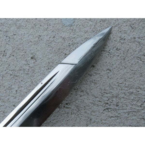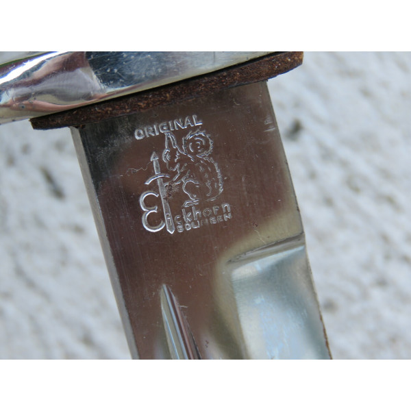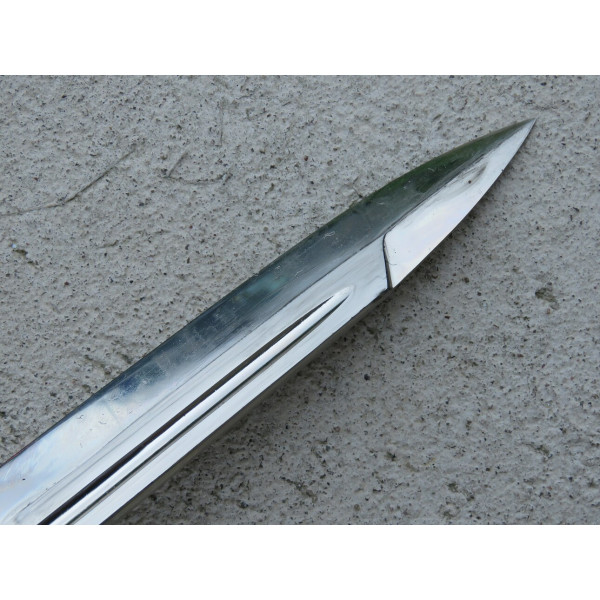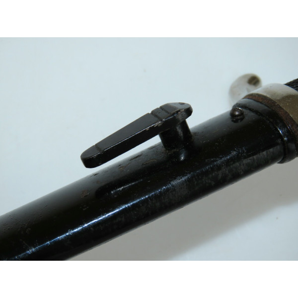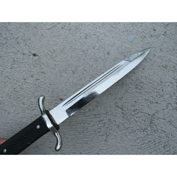 Short parade Faschinenmesser issued to members of the fire brigades and fire police of the Third Reich. Produced by Eickhorn of Solingen, featuring the squirrel with sword logo on the ricasso. The blade is very well preserved, the scabbard retains its lacquer finish with minor spider-webbing. The grip is made of heavy nickel-plated metal on both sides, fitted with intact black ebonite grip plates. A leather washer sits between blade and hilt to cushion contact with the scabbard. Overall in excellent condition.