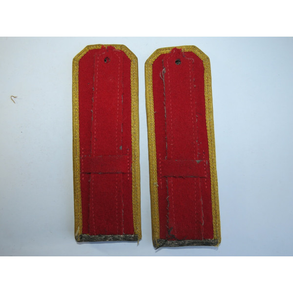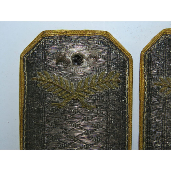 Extremely rare pair of diplomatic service shoulder boards introduced by the Decree of the Presidium of the Supreme Soviet of the USSR dated May 28, 1943. Silver braid with woven pattern and gold edging. Each board features two large gold embroidered stars and an embroidered oak branch at the top. Excellent condition.