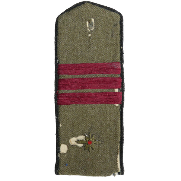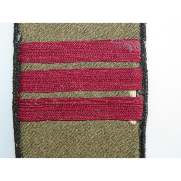 Field shoulder strap of the 1943 pattern for a Sergeant of the Signal Troops. Made of khaki wool cloth with black edging. It features three transverse crimson stripes denoting the rank of Sergeant. At the bottom is the Signal Troops emblem – wings with crossed lightning bolts and a red star in the center. Shows moth damage, otherwise well preserved.