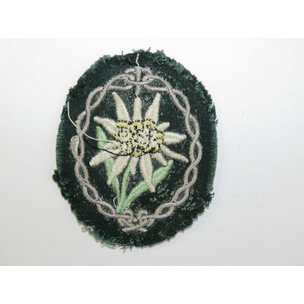 Sleeve insignia for Wehrmacht Gebirgsjäger, made of cotton moleskin with an edelweiss emblem. Removed from a tunic, with visible signs of wear and thread marks along the edges.