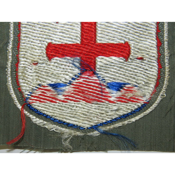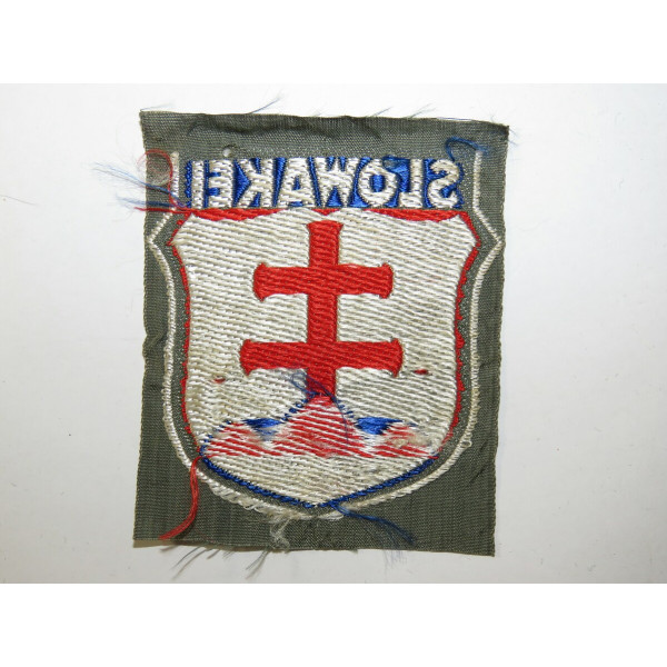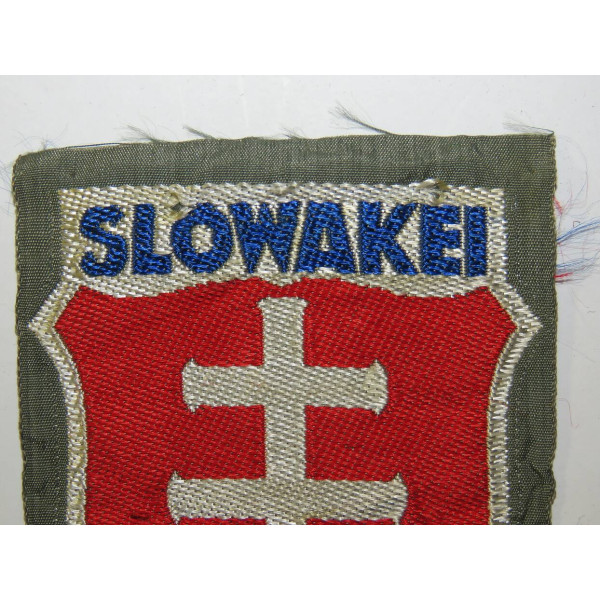 Sleeve shield for Slovak volunteers serving with the Wehrmacht Heer. Displays the Slovak coat of arms with a silver-white double cross on the central peak of a three-peaked blue mountain. Produced using jacquard weaving in BeVo style. Mint condition, unused.
