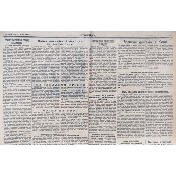 Exchange of instruments of ratification between the USSR and Finland. Government crisis in France. Resignation of the Daladier cabinet. British air raid on the island of Sylt. On the Western Front. Protest from the Norwegian Ministry of Foreign Affairs.