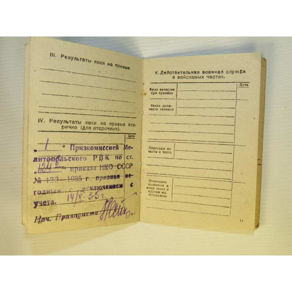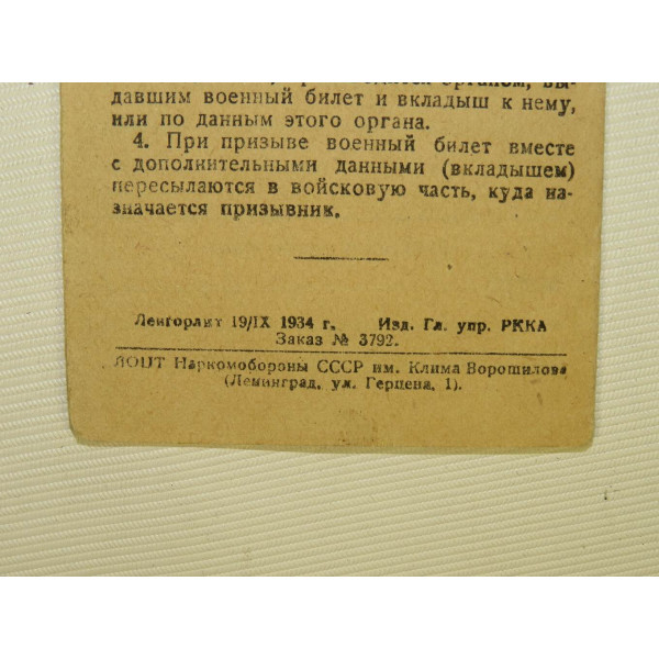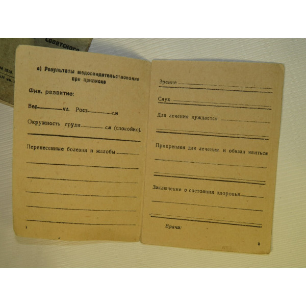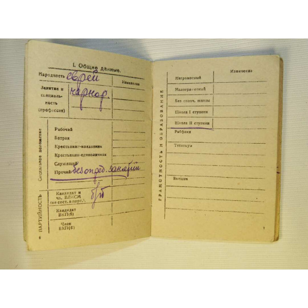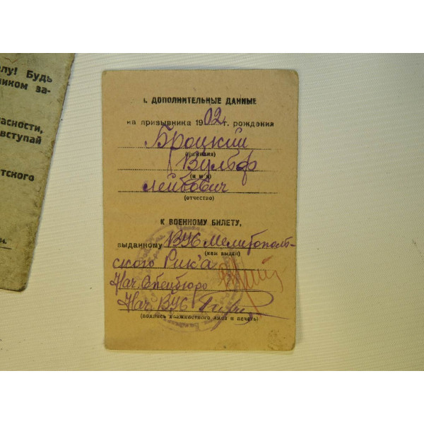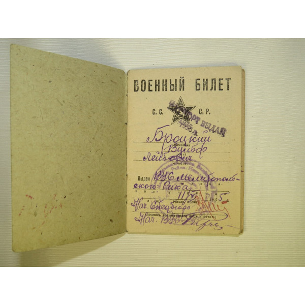 Soviet pre-war pay book issued to Brotsky Wulf Leiba son, nationality - Jew. Notes: has been imprisoned for 3 years by OGPU of Belorussian Soviet Republic in 1932 year for illegal crossing the Russian-Poland boarder. Probably he did that crime special to avoid service in Red Army. Excellent condition