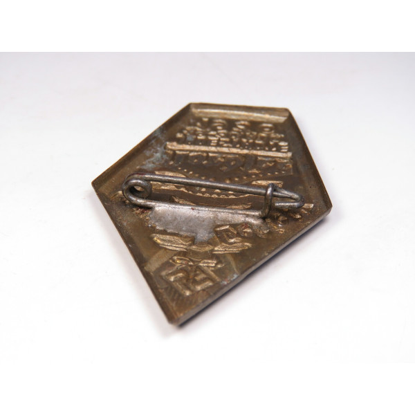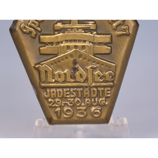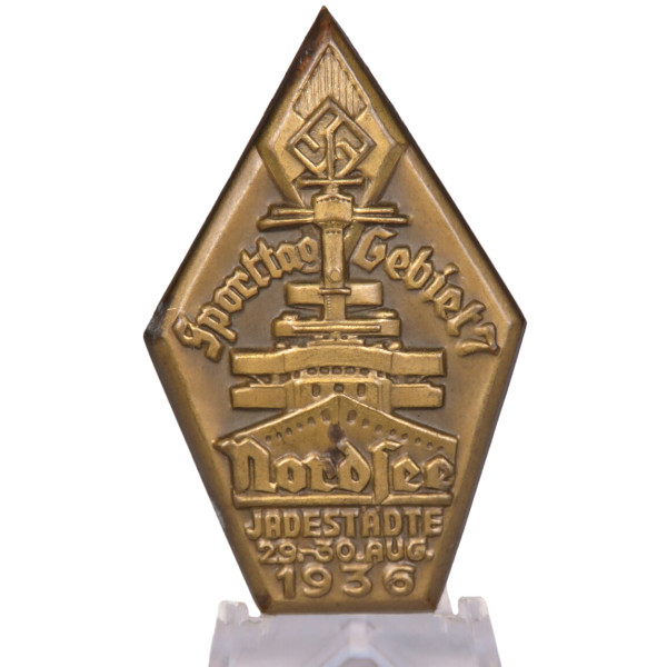 Participant badge for the Nordsee District Sports Day, held in Jadestadt on 29–30 August 1936. The obverse features a stylized emblem, lighthouse, and ship’s bow, with inscriptions: “Sporttag Gebiet”, “Nordsee”, “Jadestädte 29.–30. Aug. 1936”. Stamped from tinplate with brass finish and toned highlights. Good collectible condition.